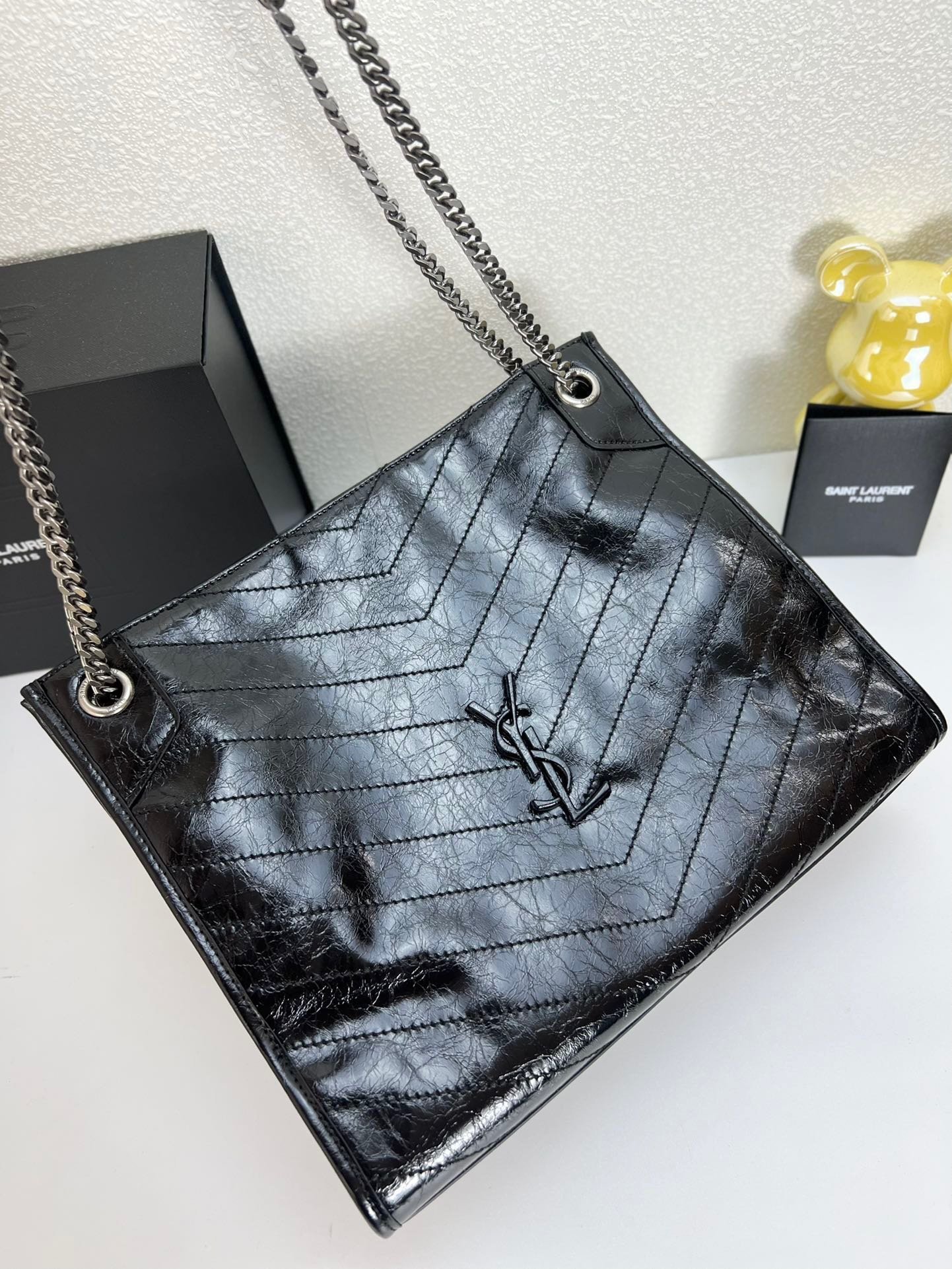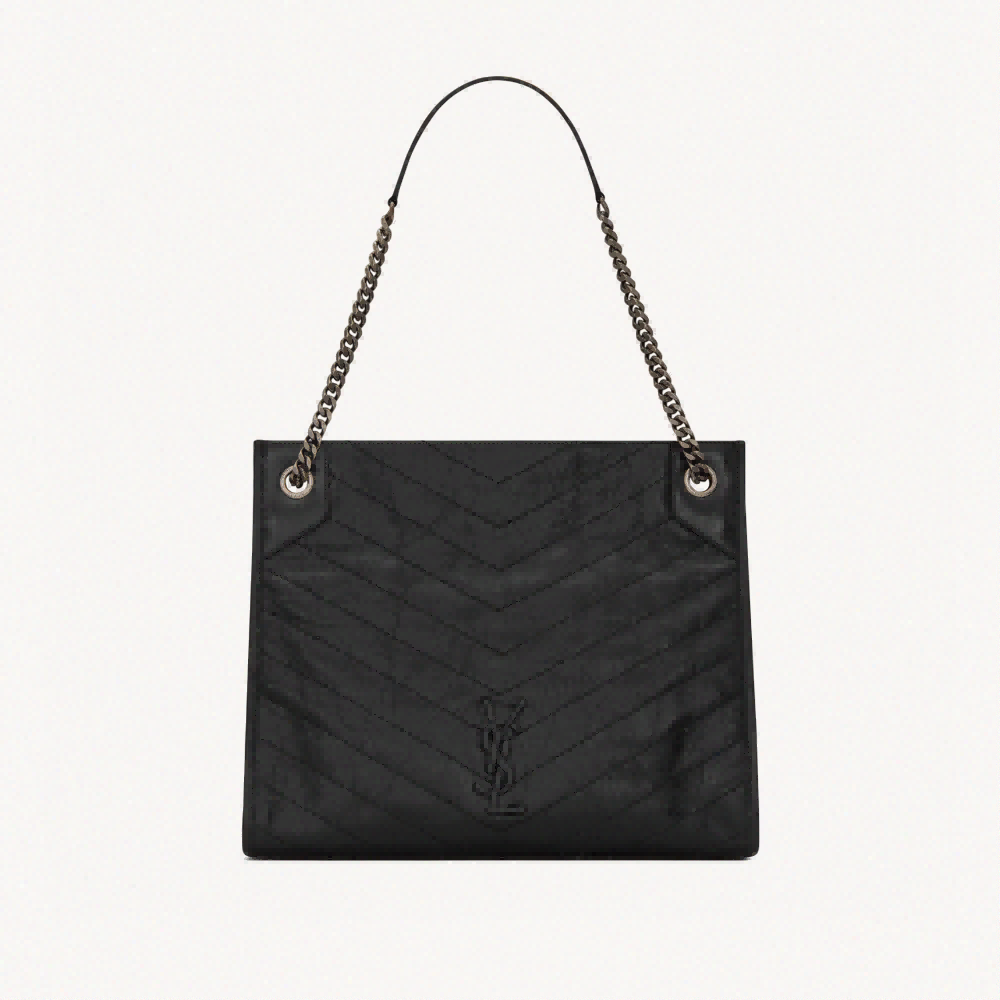 NIKI Shopping Bag Pleated Vintage Oil waxed leather Saint Laurent Tote Bag Upholstered leather-covered YSL initial shoulder Bag 100% calfskin Antique Silver Metal hardware Rolework lining magnetic buckle inside with a zipper pocket