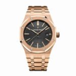 The Audemars Piguet Royal Oak 15500OR.OO.1220OR.01 Replica is a luxury watch crafted with 904L stainless steel in a rose gold color. The case is 41.00 mm in size and features a sapphire crystal. The bracelet is also crafted from 904L stainless steel and is adjustable for all sizes. The dial is black with a stick. dot indices. and Royal Oak hour markers.