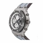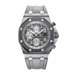 The Audemars Piguet Royal Oak Offshore Replica 26470IO.OO.A006CA.01 is a 1:1 super clone Swiss mechanism watch. It features a 904L stainless steel case with a grey bezel. a sapphire crystal. and a 42.00mm size and 14.18mm thickness. The movement is an Automatic AP 3126 / 3840 with a 60-hour power reserve and a precision of (-3/+3 sec/day) within COSC certification limits. The dial is silver-toned with Arabic numerals and Royal Oak hour-marker and hands. The bracelet is a rubber dark grey adjustable link with a 904L stainless steel pin clasp.