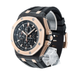 The Audemars Piguet Royal Oak Offshore 26406FR.OO.A002CA.01 replica is a luxury watch. It features a 904L stainless steel case with a pink gold. ceramic. and carbon color. The bezel is made of stainless steel and is also pink gold. The sapphire crystal is 44.00 mm in size and 14.45 mm in thickness. The bracelet is made of rubber and is adjustable for all sizes. It has a 904L stainless steel fold clasp in pink gold