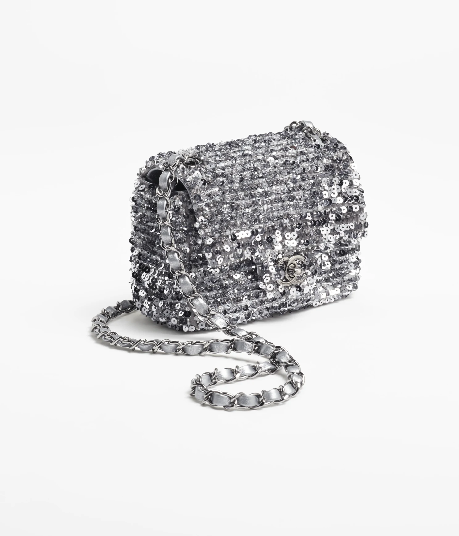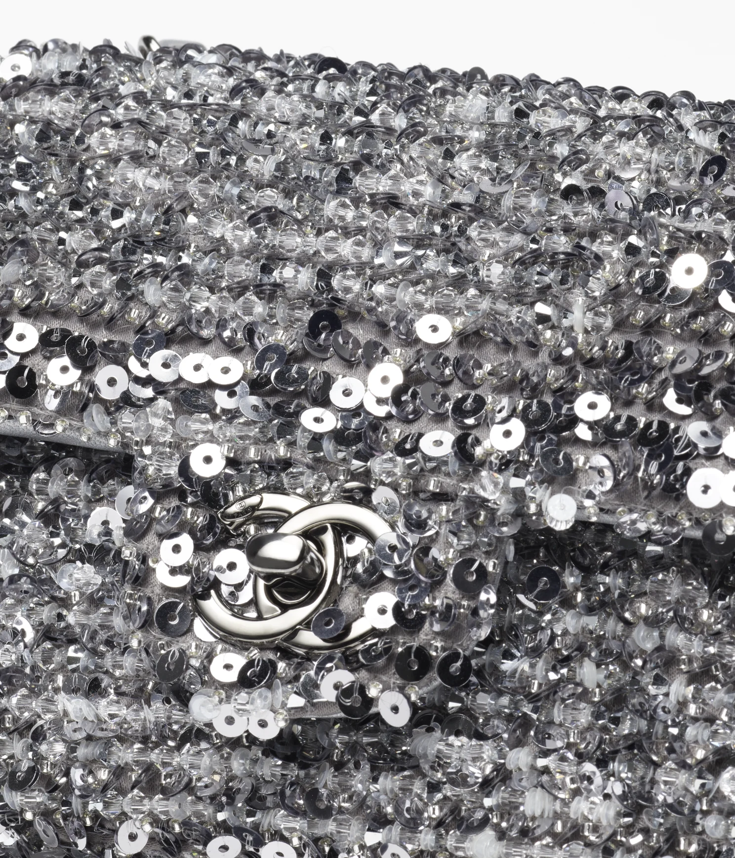 CHANEL / MINI FLAP BAG Embroidered Satin. Sequins. Glass Pearls & Ruthenium-Finish Metal Ref. AS4269 B13685 NQ843 Silver