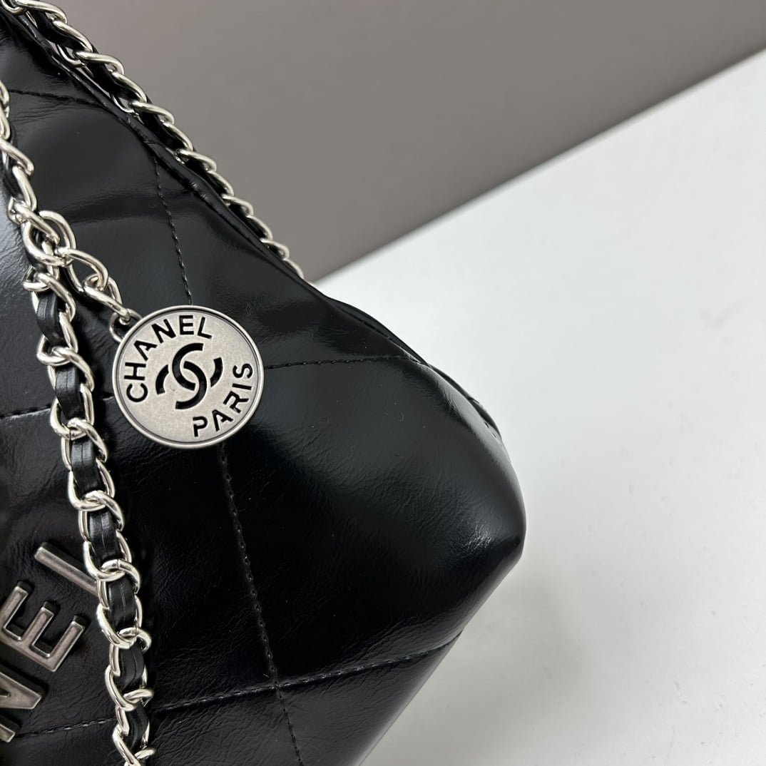 CHANEL Pearl garbage bag black with sliver hardware size: 23*28*22*7cm