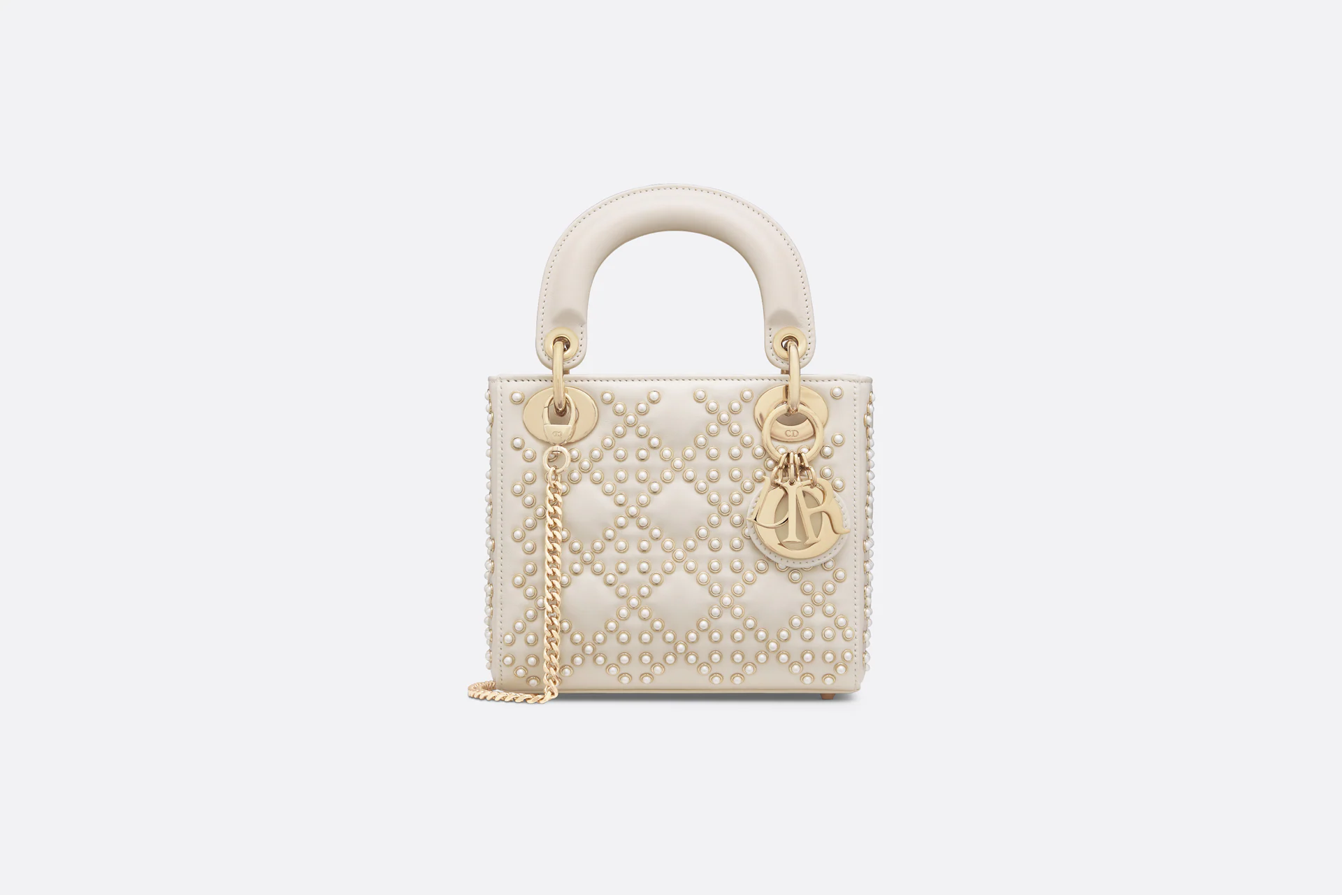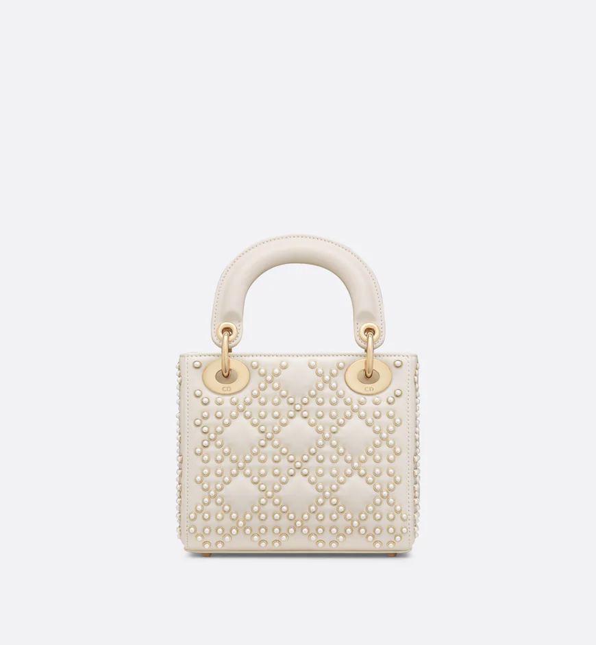 The Lady Dior bag embodies the House’s vision of elegance and beauty. Sleek and refined. the style is timeless. Crafted in latte lambskin with a crinkled effect. it is adorned with white resin half-pearls and rivets displaying the Cannage motif. Pale gold-finish metal D.I.O.R. charms further embellish its silhouette. Featuring a removable chain strap. the miniature Lady Dior bag can be carried by hand or worn crossbody as an ideal evening wear companion.
