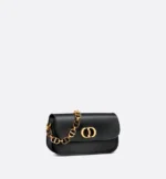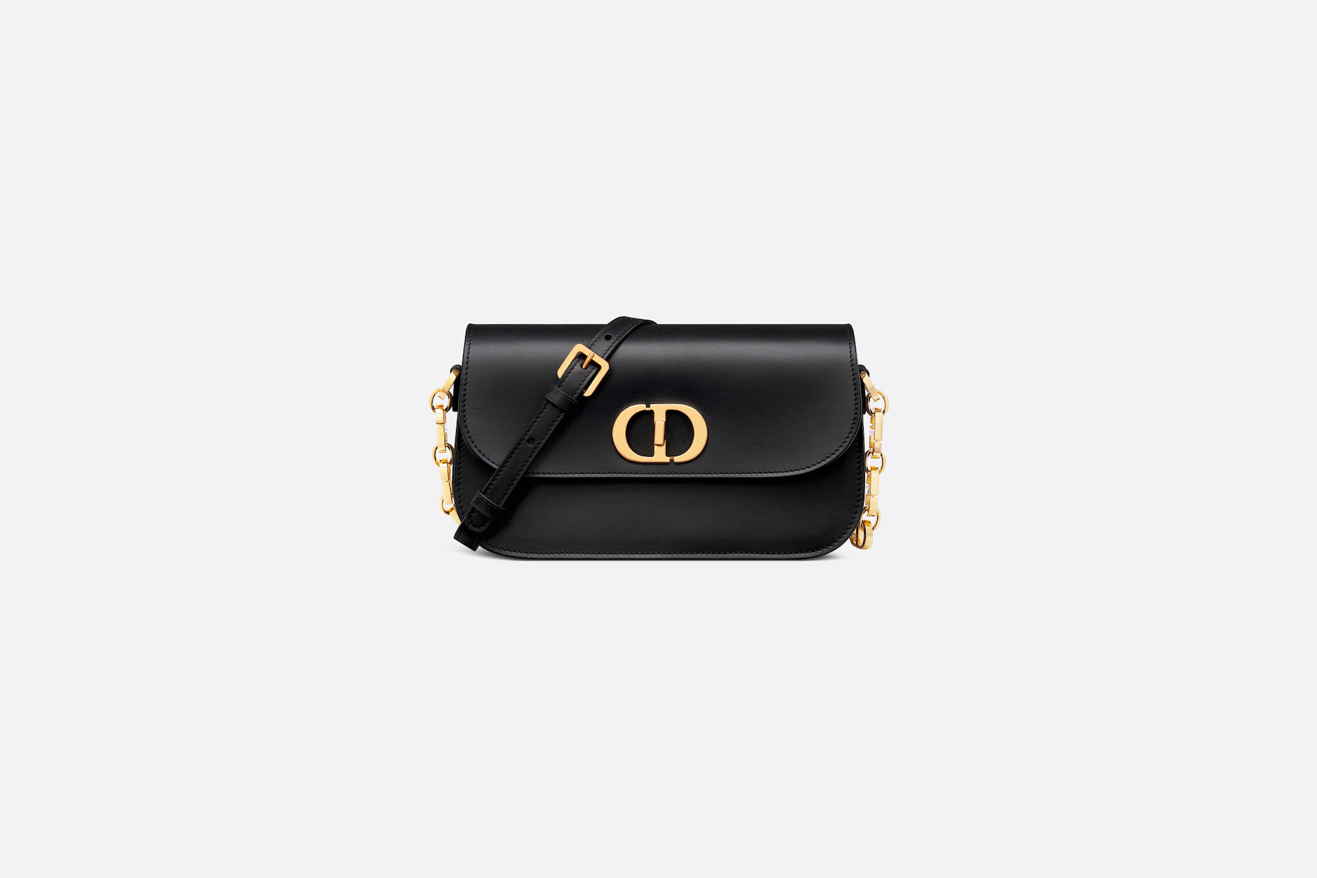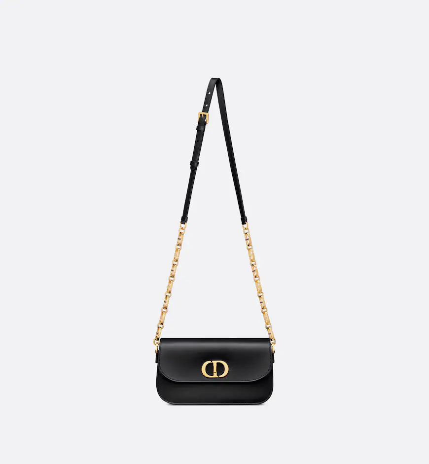 The 30 Montaigne Avenue bag enhances the hallmark line with a timeless and elegant shape. Crafted in black box calfskin. the rounded flap with delicate curves is punctuated by an antique gold-finish metal CD twist clasp inspired by the seal of a Christian Dior perfume bottle. The design is completed by other details. like the 30 Montaigne signature embossed on the back and the signature chain alternating gold-finish metal and tonal enamel links that match the leather. The small. gusseted bag features a refined silhouette that can be carried by hand. worn over the shoulder or crossbody.
