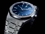The Frosted AP Blue Replica is a luxurious watch from the Audemars Piguet Royal Oak family. It features an automatic movement with a caliber AP 2713 and a power reserve of 60 hours. The precision of the watch is within COSC certification limits. with a sweep motion second hand. The case is made of 904L stainless steel with a white gold and gem set color. and the bezel is also made of 904L stainless steel with a white gold and gem set color. The crystal is sapphire and the size is 33.00 mm with a thickness of 7.00 mm. The bracelet is also made of 904L stainless steel with a white gold and gem set color. and it has adjustable links as genuine for all sizes. The clasp is also made of 904L stainless steel with a white gold and gem set color and an AP folding clasp.