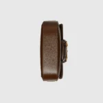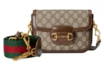 Petite versions of the Gucci Horsebit 1955 add a hybrid twist to the vintage inspired line. Enriched with two different shoulder straps. the mini bag’s character transforms from understated elegance with a tonal leather strap to a strong logo feel thanks to a red and green Web option. The accessory is presented in monogram canvas with a brown leather trim.