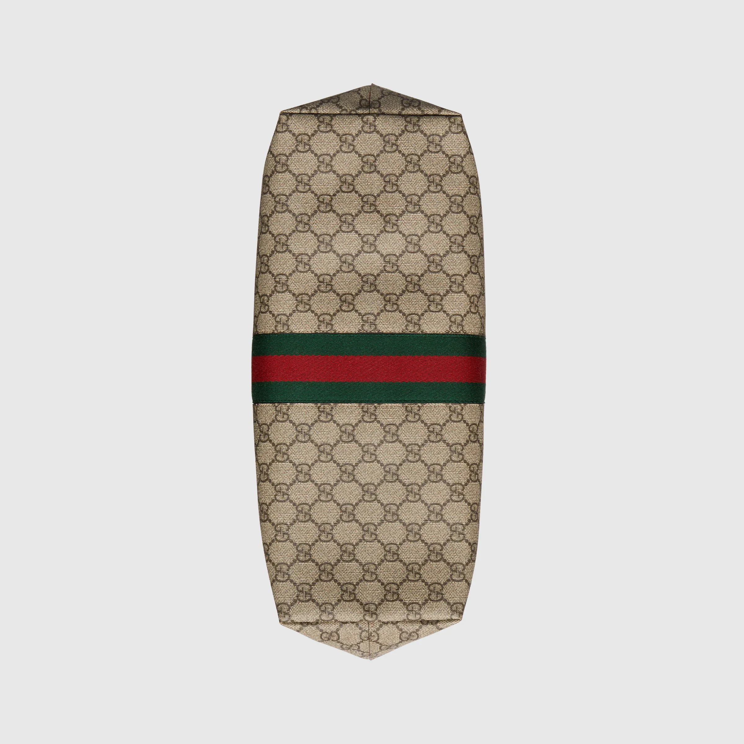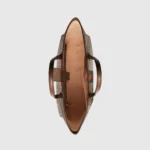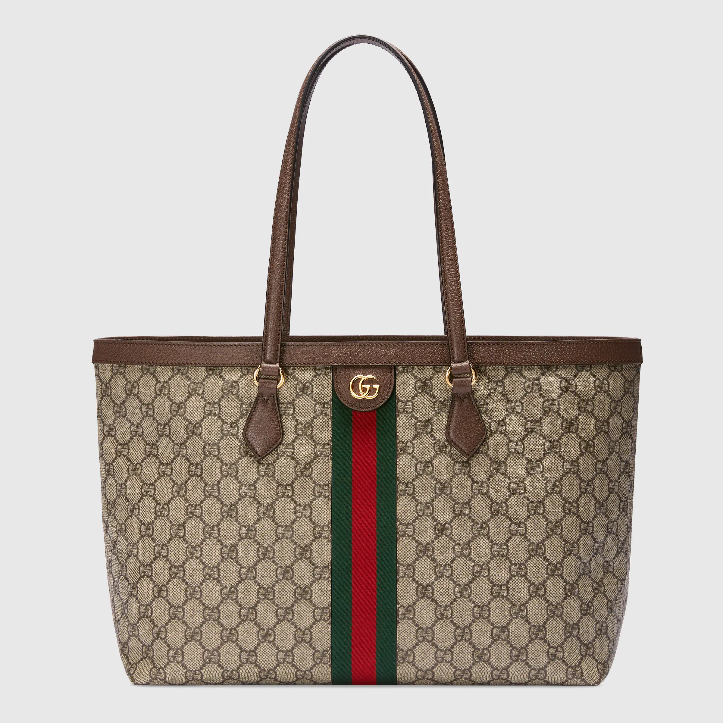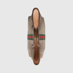 A classic combination of the House’s most defining codes??the GG motif and Web stripe??the world of Ophidia continues to evolve. incorporating new shapes and silhouettes each season. With recognizable design elements in a practical new shape. this new medium sized tote is trimmed with textured leather and topped with Double G hardware. Thanks to its long leather handles. the style can also be carried as a shoulder bag.