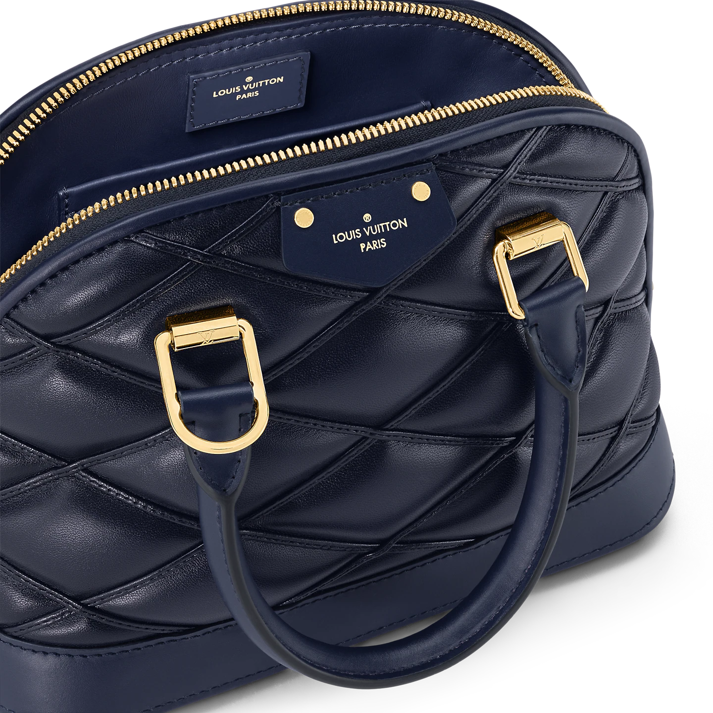 Nicolas Ghesquière constructs the iconic Alma BB handbag in padded lambskin. embellished with a shaded effect. Applied by hand. the toasted aspect brings a modern elegance to the bag’s Art Deco-inspired shape. Two top handles and a removable strap enable a variety of carries. A golden padlock and leather key bell complete the design.