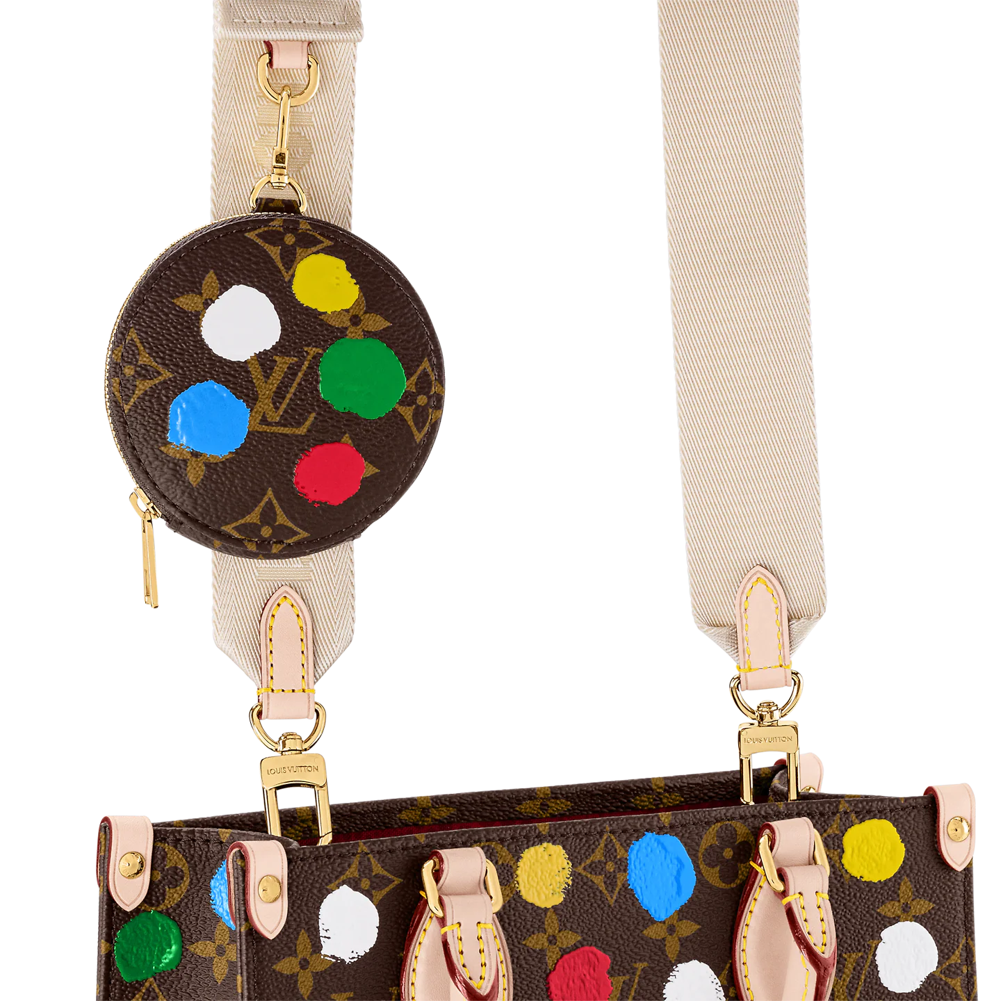 The LVxYK OnTheGo PM is part of the second exclusive Louis Vuitton x Yayoi Kusama collection. renewing the House’s close friendship with the revered Japanese artist. A sophisticated multi-step printing process on Monogram canvas reproduces Kusama’s colorful dots. a unifying theme in her work. with a strikingly realistic hand-painted effect. And it’s a marvelously practical bag. with a handy removable coin purse.