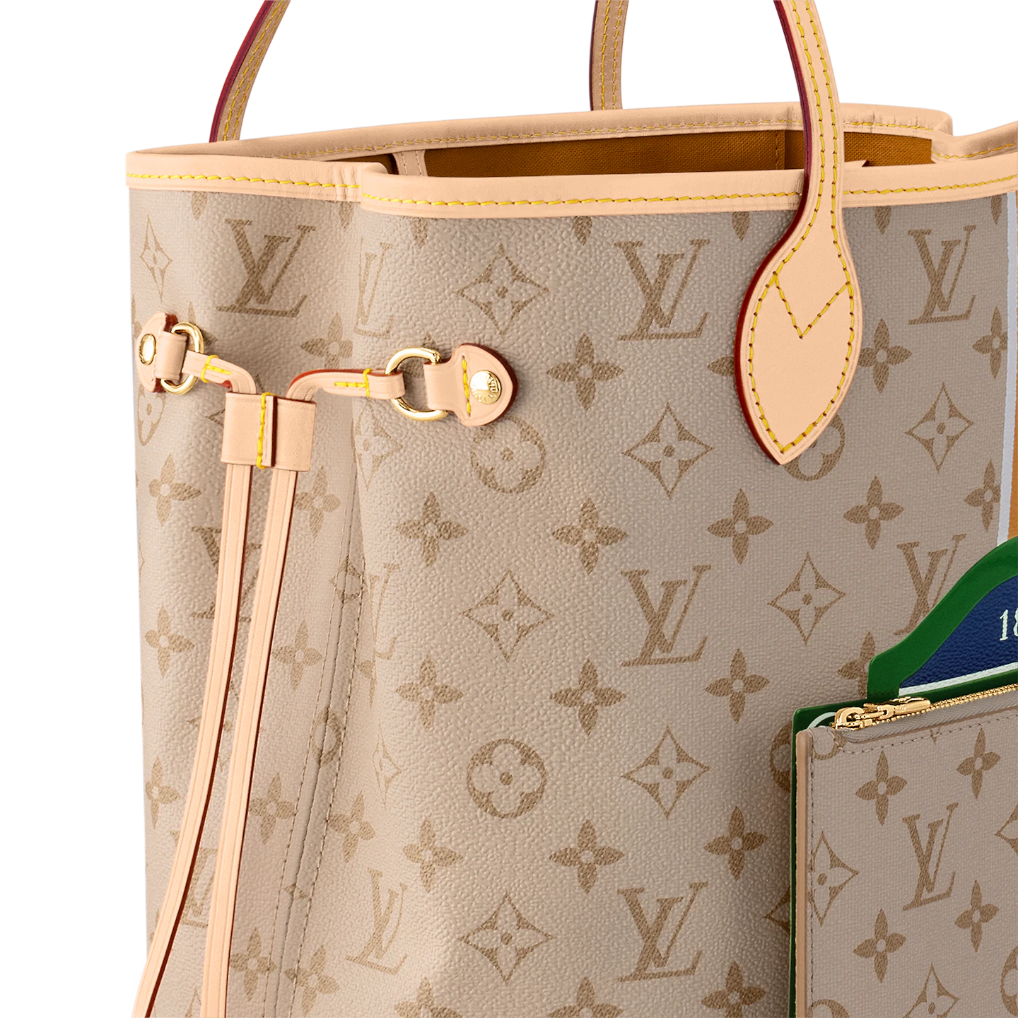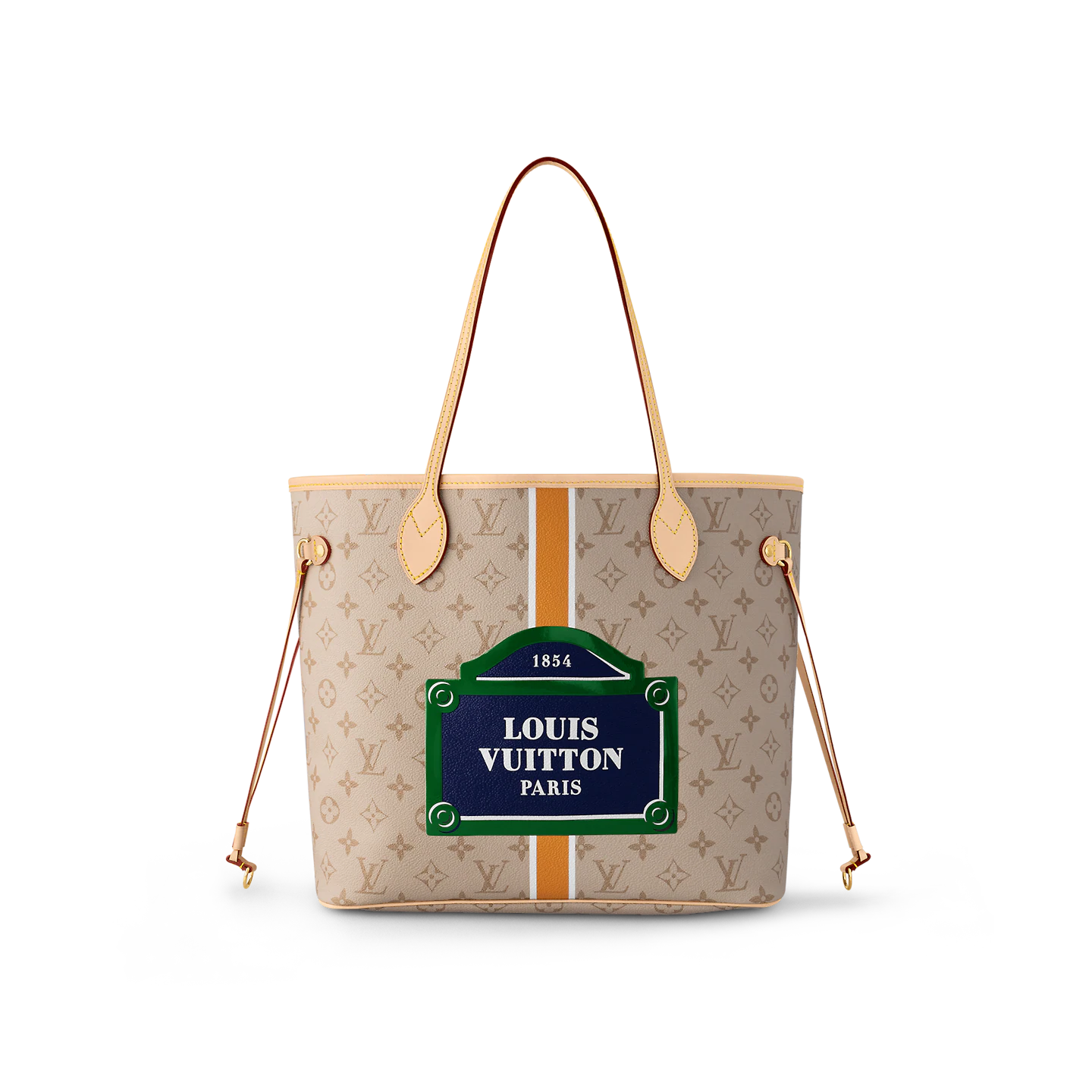 This Neverfull MM tote bag is made from a beige Monogram canvas adorned with what looks like a Parisian street-sign: white letters on a blue background in a green frame. Only here the street is Louis Vuitton Paris. The white-ocher-white vertical stripe and natural cowhide-leather trim with yellow stitching evoke detailing on the House’s vintage trunks.