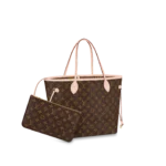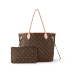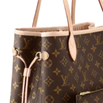 The Neverfull MM tote unites timeless design with heritage details. Made from supple Monogram canvas with natural cowhide trim. it is roomy yet not bulky. with side laces that cinch for a sleek allure or loosen for a casual look. Slim. comfortable handles slip easily over the shoulder or arm. Lined in colorful textile. it features a removable pouch which can be used as a clutch or an extra pocket.