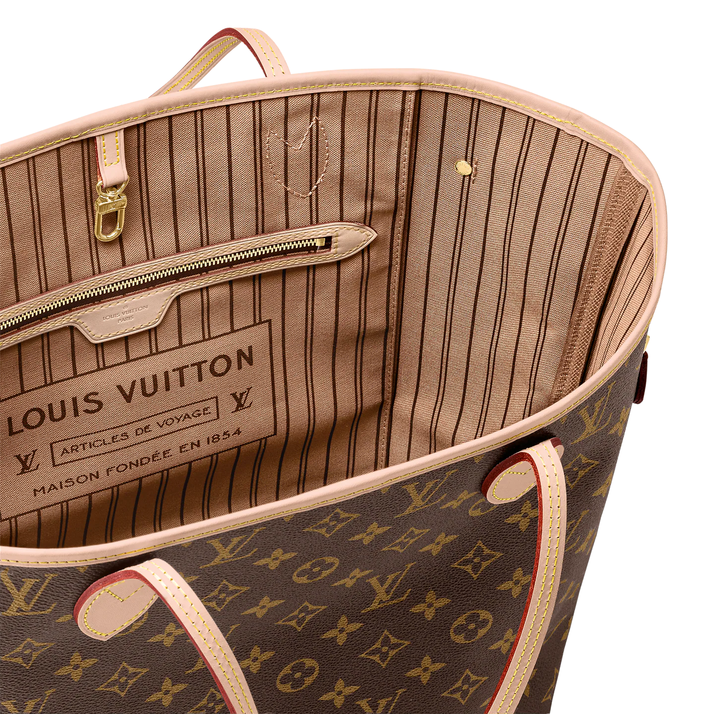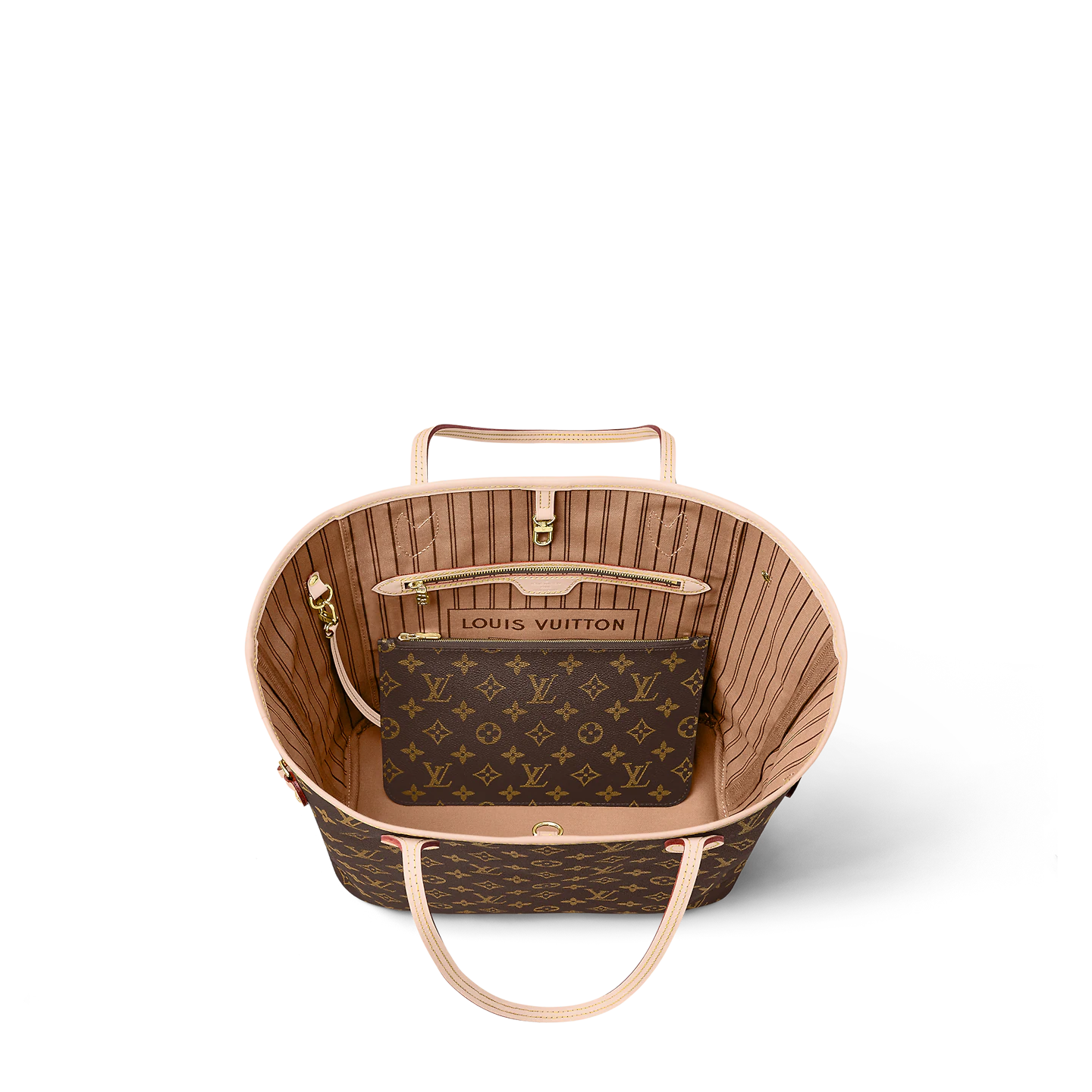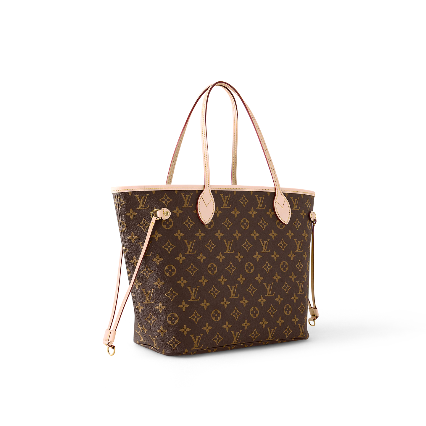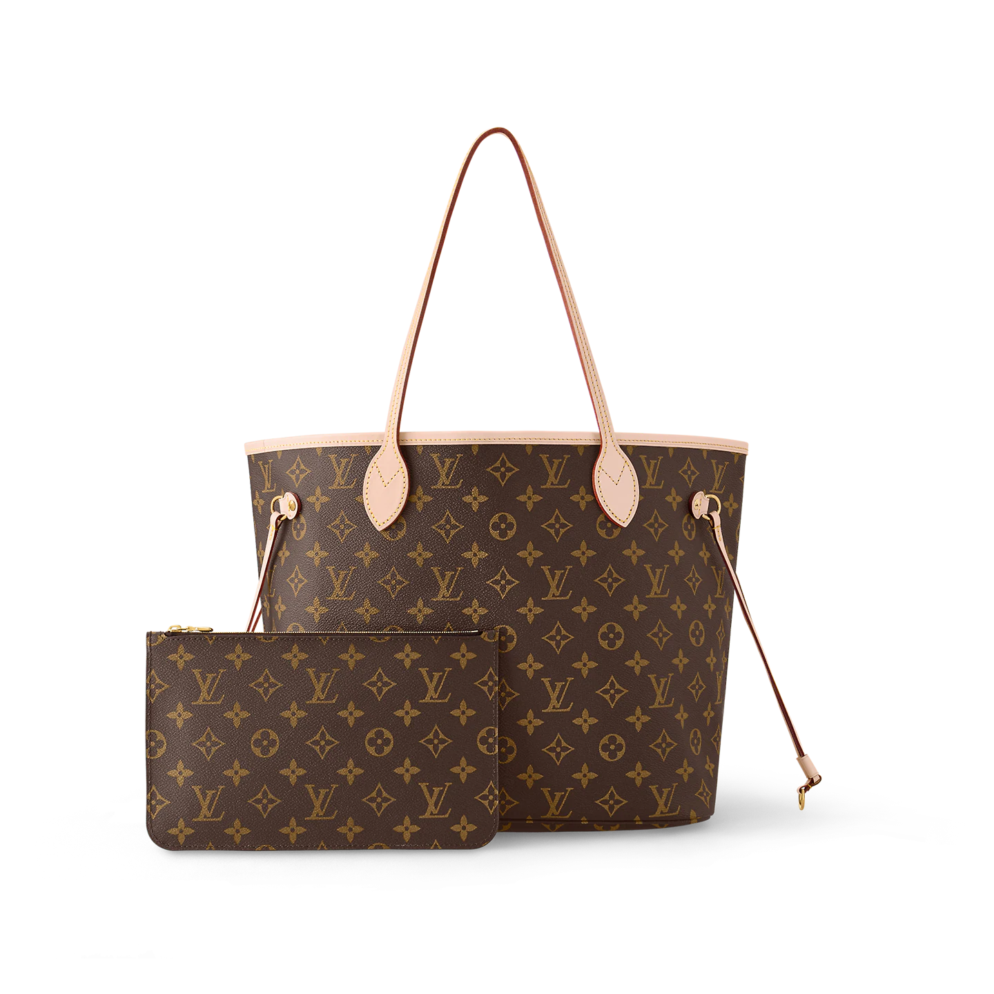 The Neverfull MM tote unites timeless design with heritage details. Made from supple Monogram canvas with natural cowhide trim. it is roomy yet not bulky. with side laces that cinch for a sleek allure or loosen for a casual look. Slim. comfortable handles slip easily over the shoulder or arm. Lined in colorful textile. it features a removable pouch which can be used as a clutch or an extra pocket.