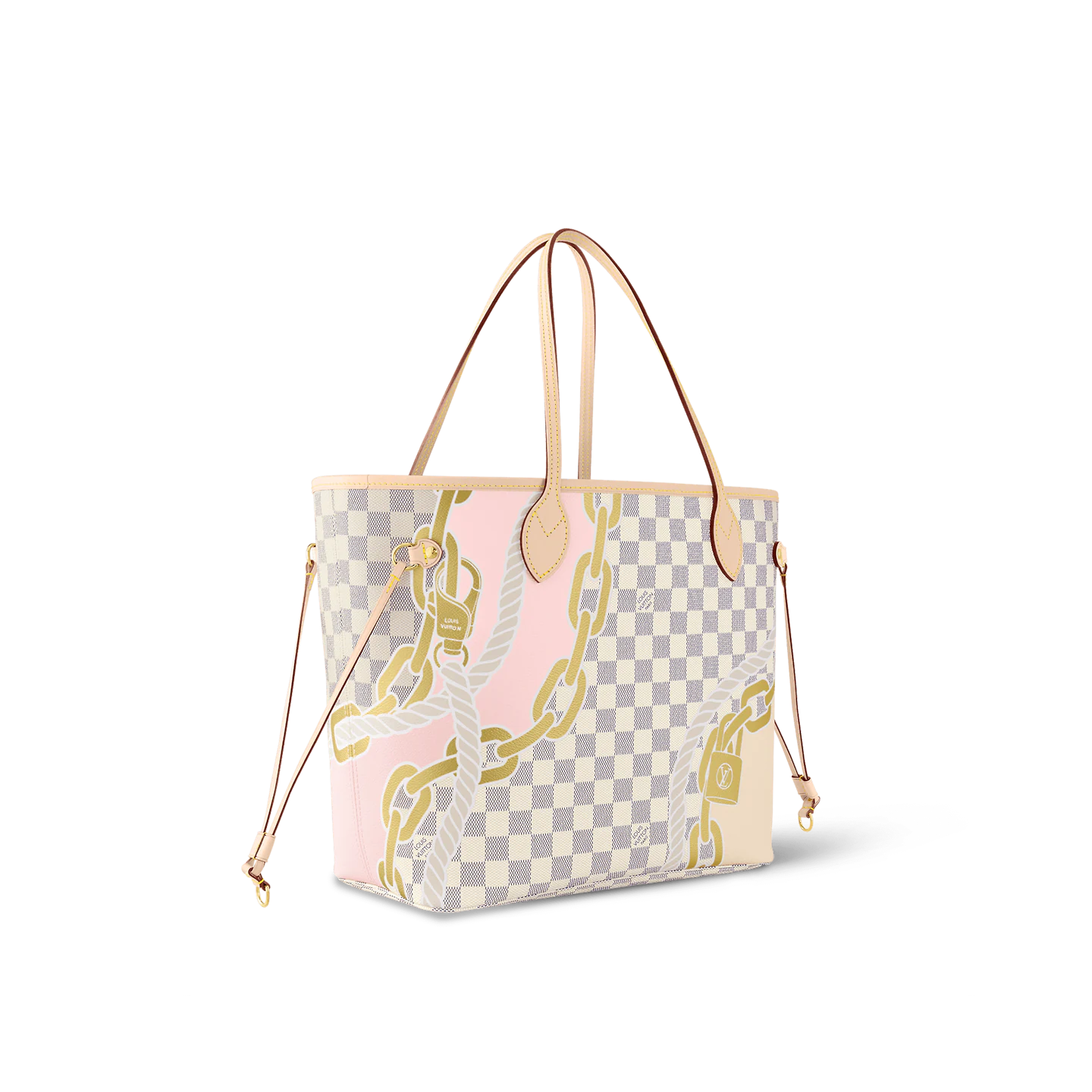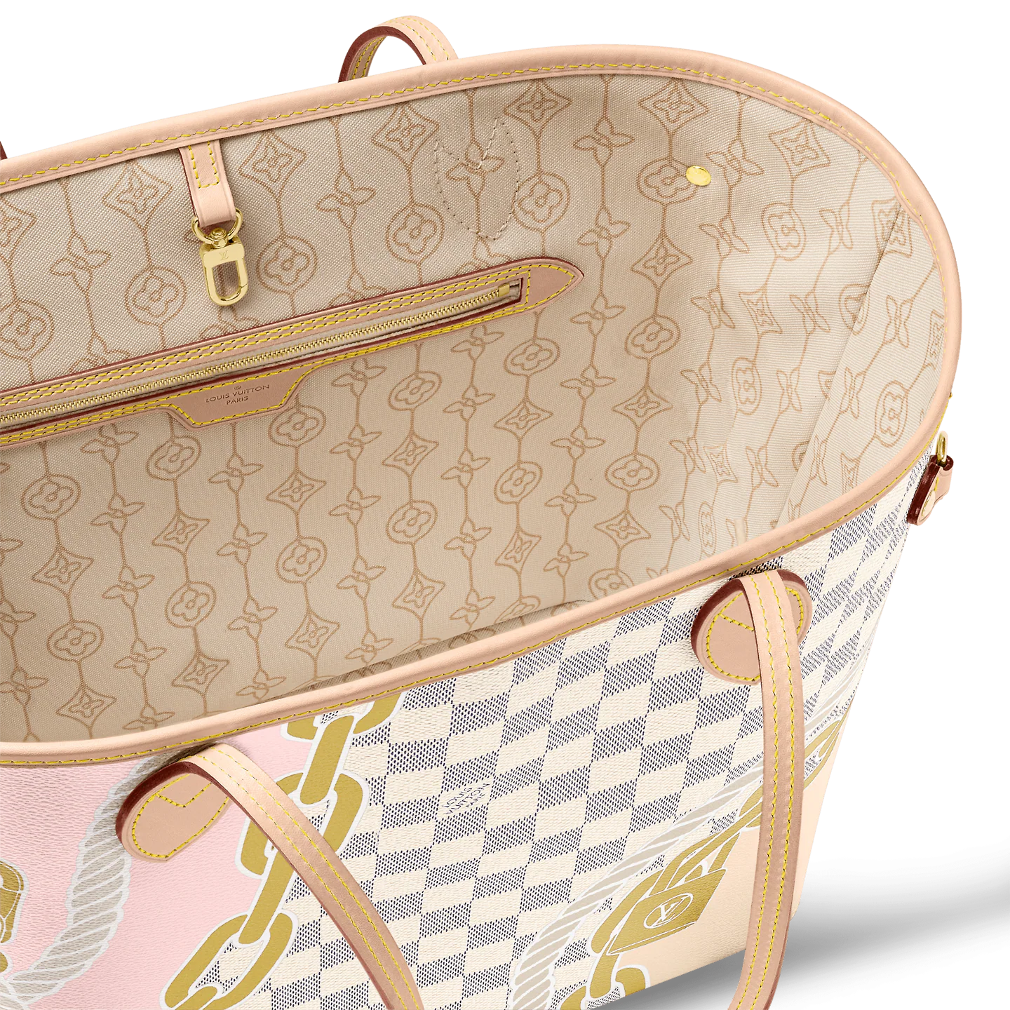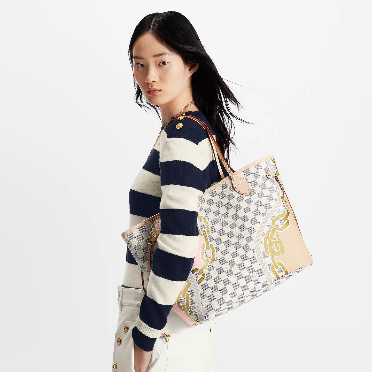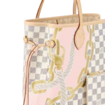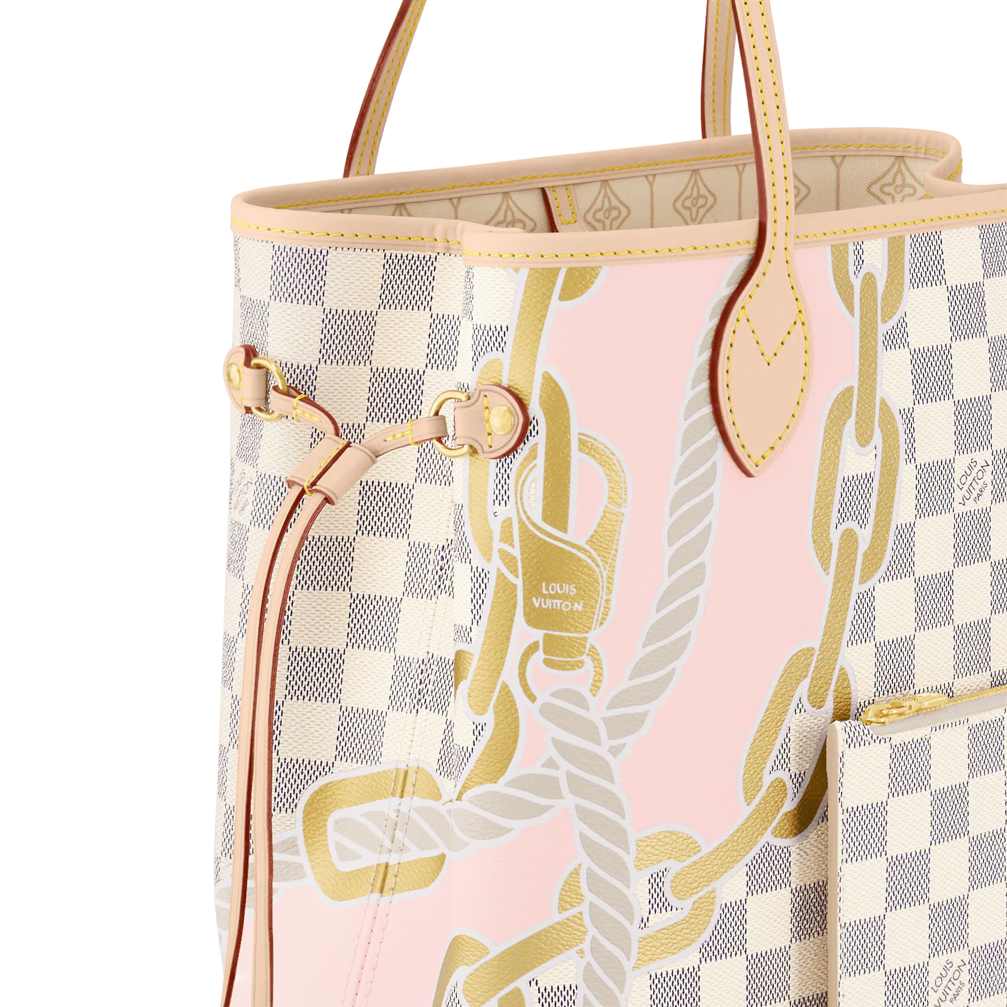 This Neverfull MM tote bag is made from Damier Azur coated canvas customized with a bold five-color nautical print of ropes and chains. bringing a fresh twist to the classic checkerboard pattern. This versatile bag features side laces that can be cinched for a sleeker silhouette or loosened for a more casual look.