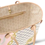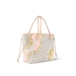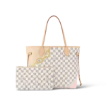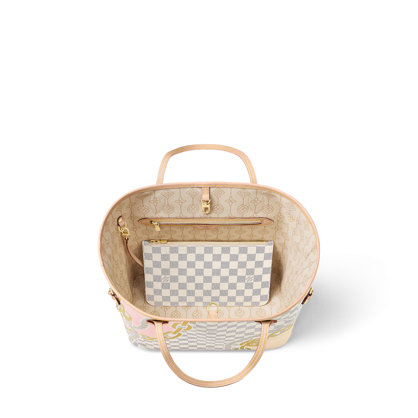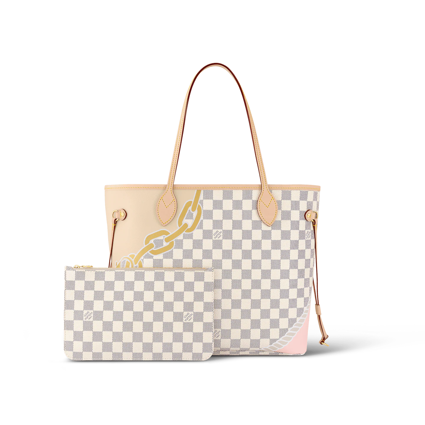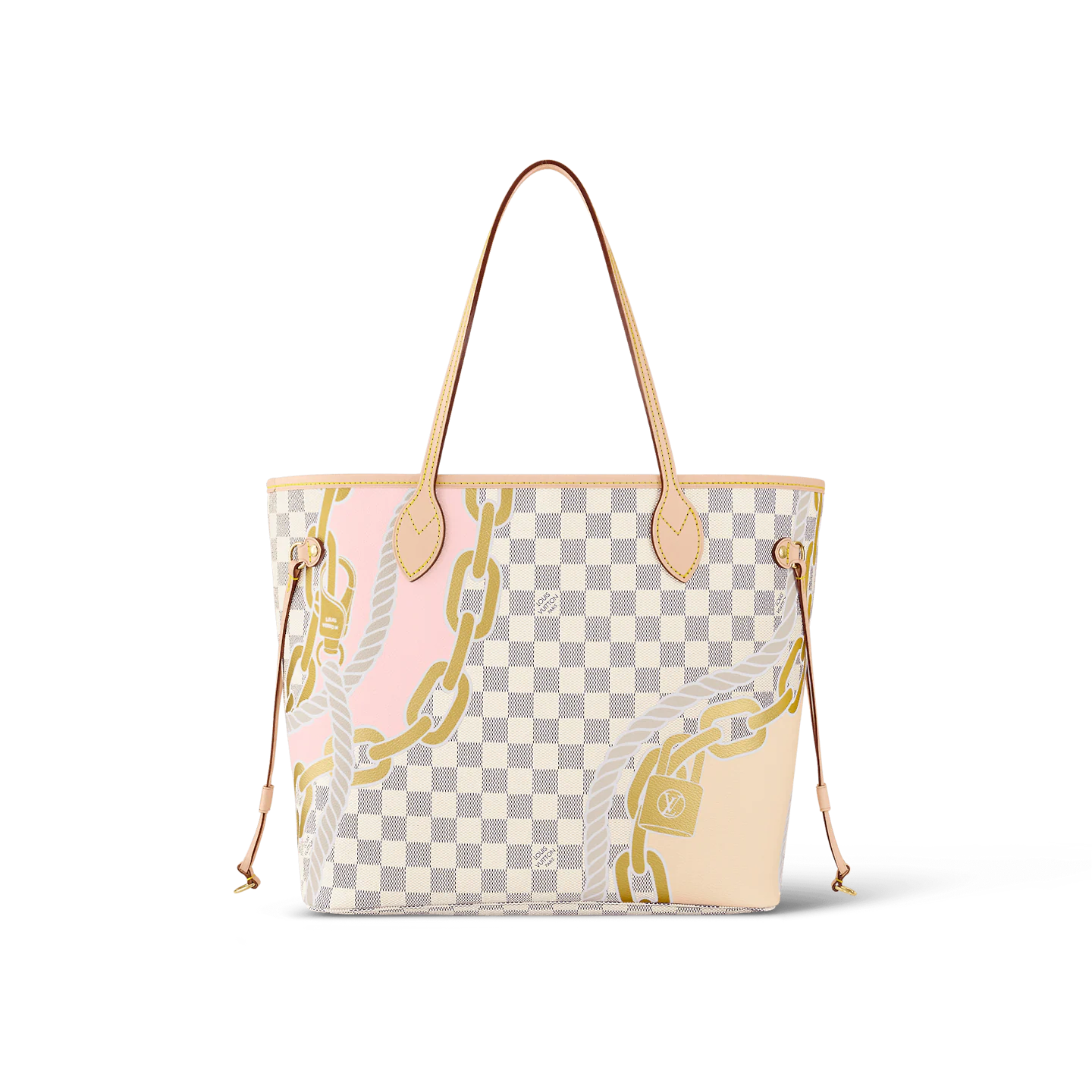 This Neverfull MM tote bag is made from Damier Azur coated canvas customized with a bold five-color nautical print of ropes and chains. bringing a fresh twist to the classic checkerboard pattern. This versatile bag features side laces that can be cinched for a sleeker silhouette or loosened for a more casual look.