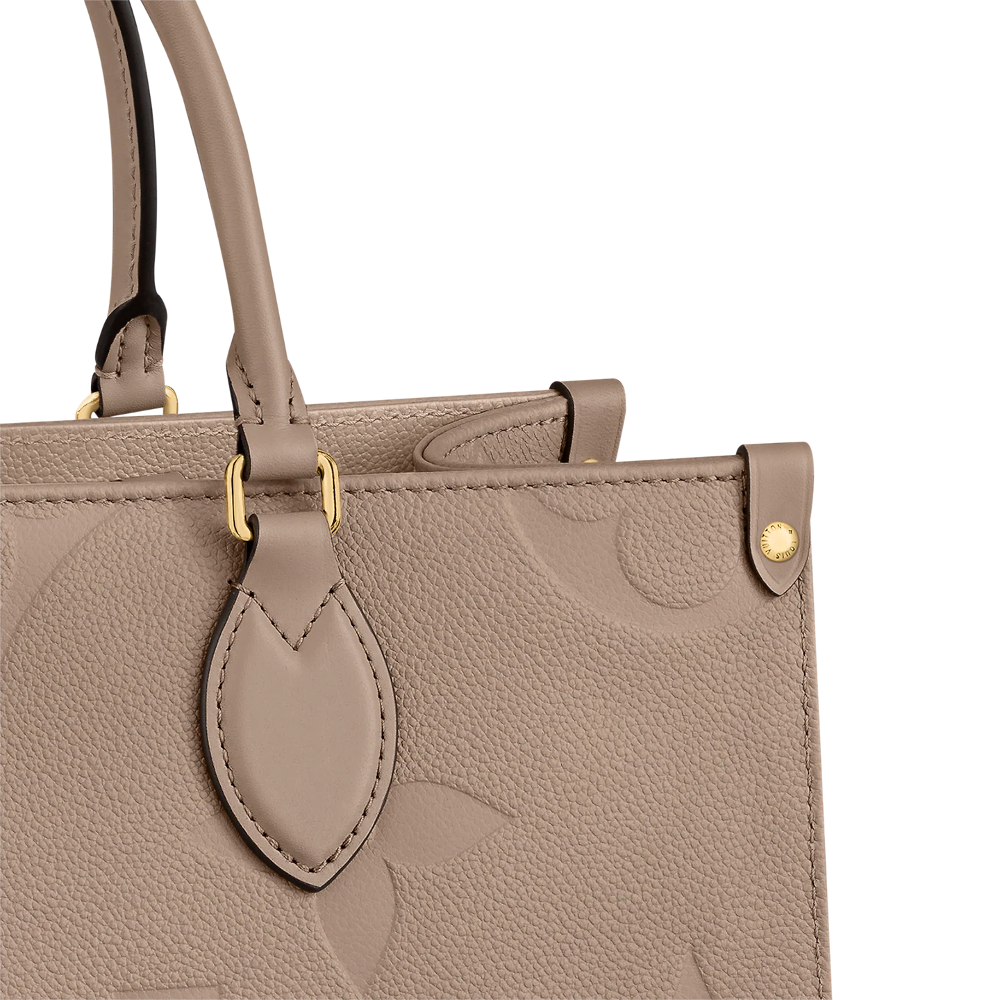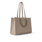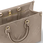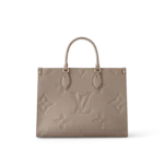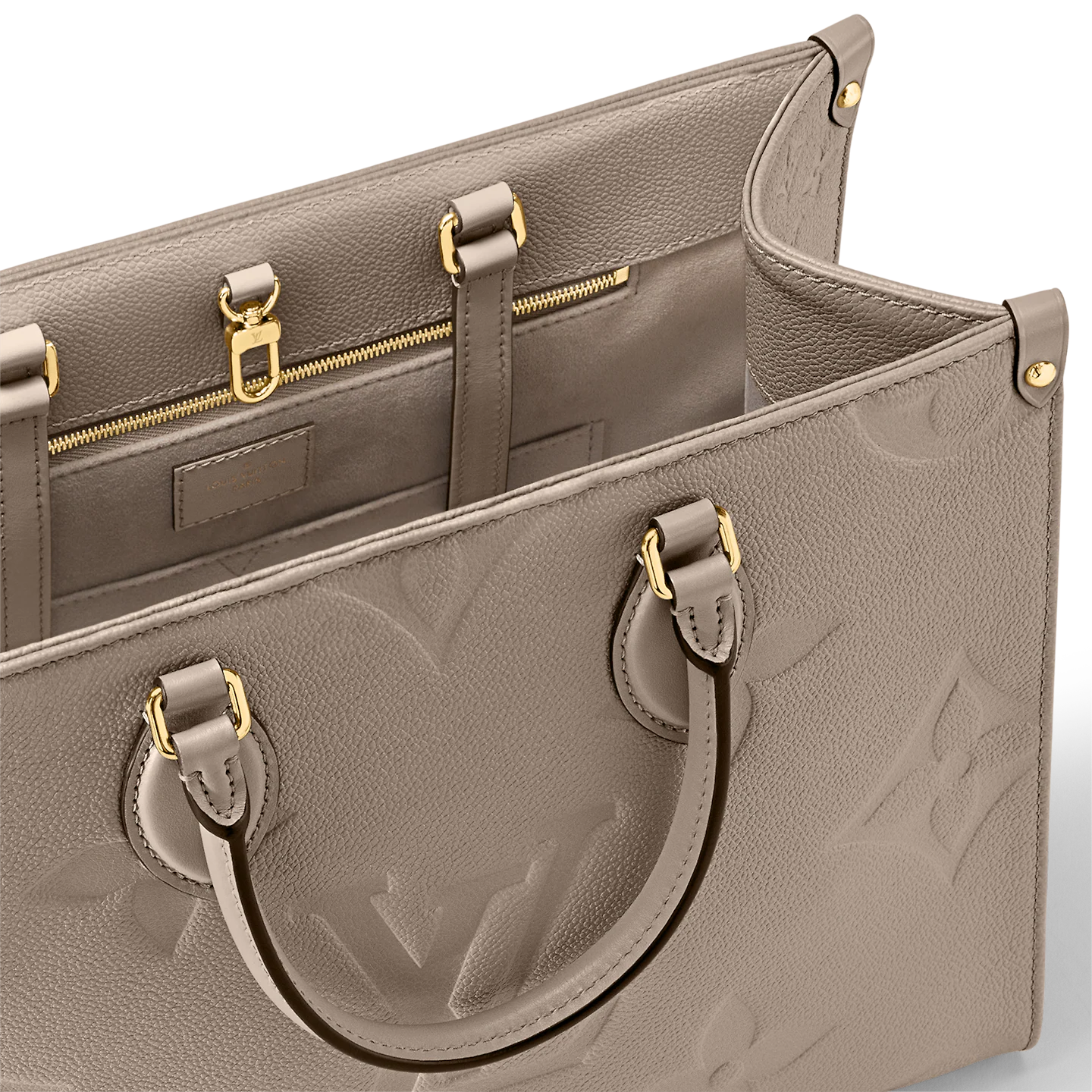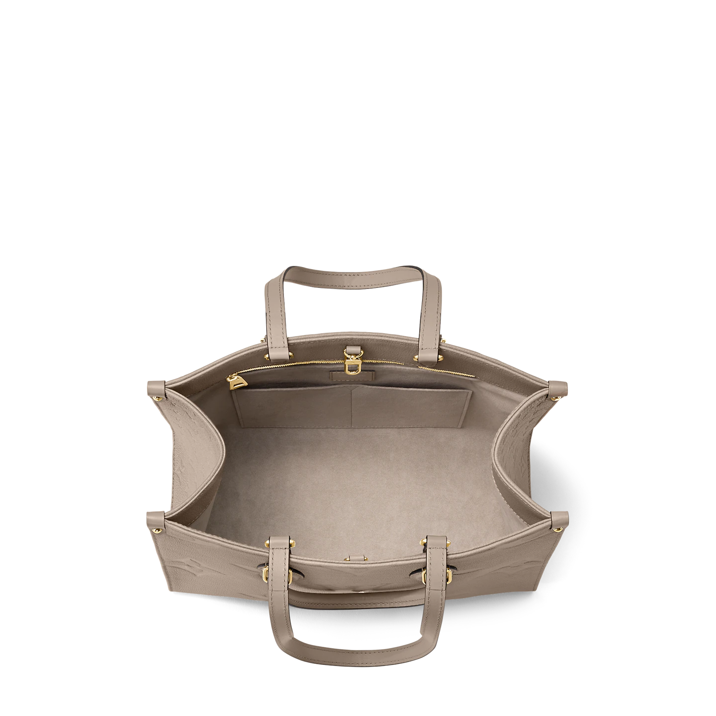 For Spring 2021. Louis Vuitton launches the Onthego MM tote bag in grained Monogram Empreinte. a soft leather that is embossed with a large and modern Monogram pattern. Thanks to the square shape. it boasts a generous capacity and can easily fit a laptop. Its articulated top handles and shoulder straps give carrying options.