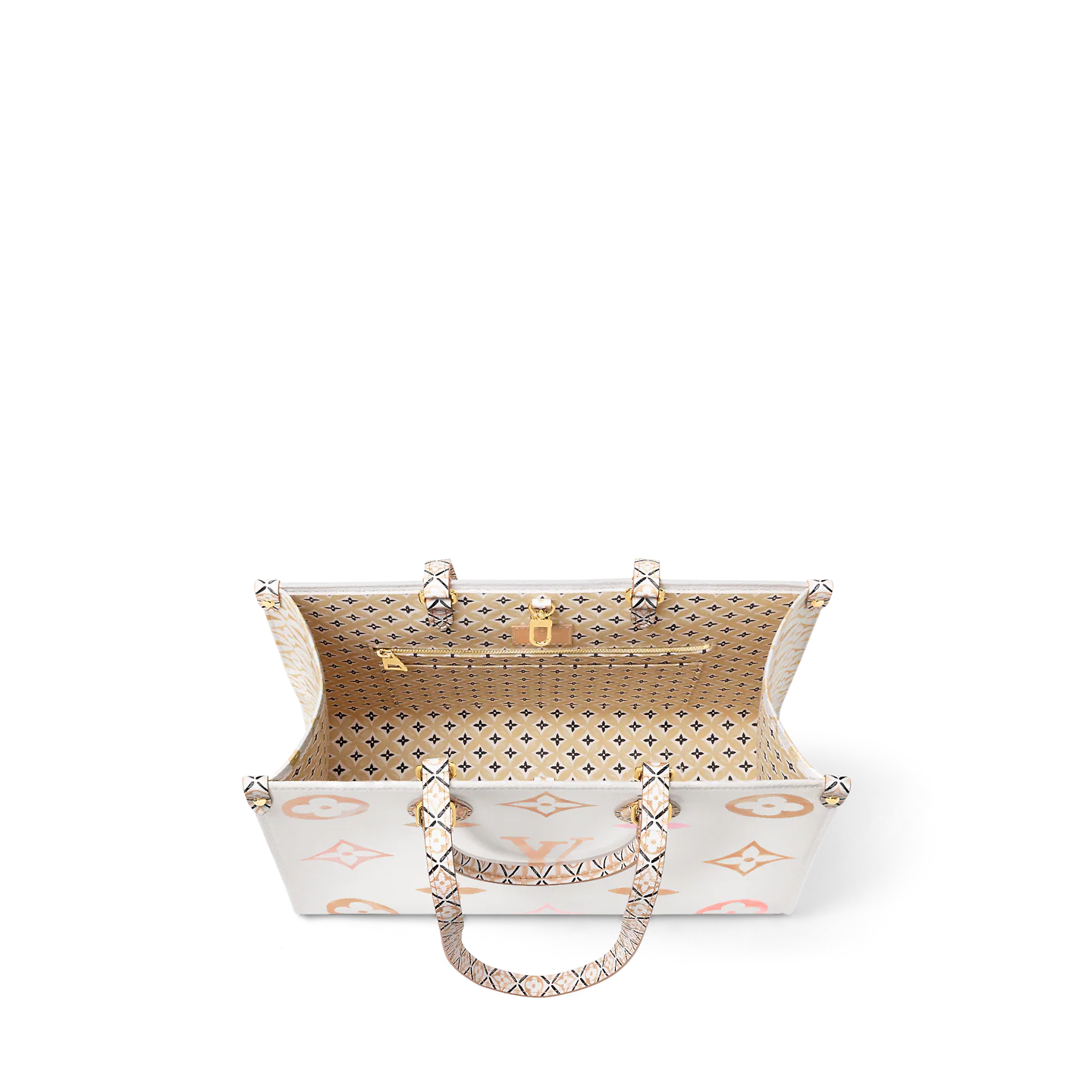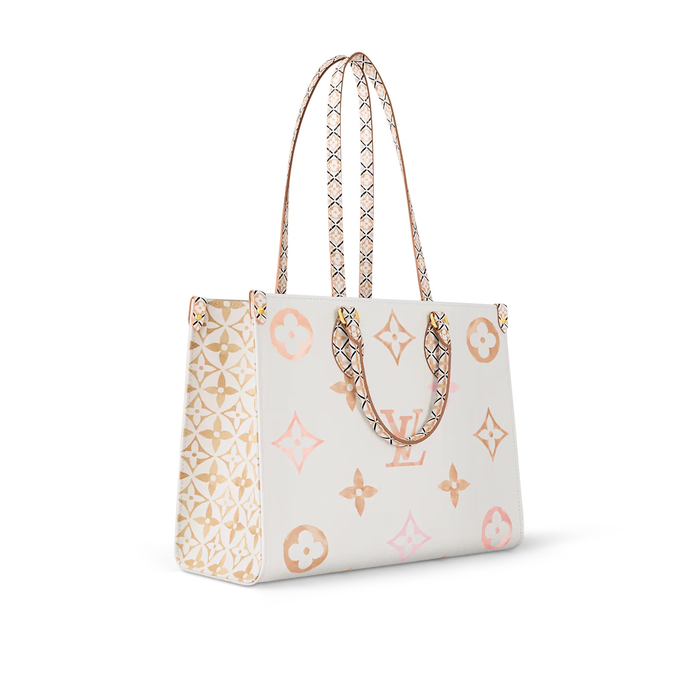 The OnTheGo MM tote bag is made from coated canvas with an oversized Monogram pattern on a cream-colored background. The bag’s trim and interior lining feature intricate Monogram Flower prints. inspired by traditional Portuguese azulejo tiles. The roomy interior and two sets of handles. long and short. make it a versatile everyday bag.