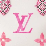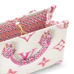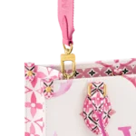 The OnTheGo PM is a handbag-sized tote in cream-color canvas with a pastel-color Giant Monogram pattern. The pattern is paired with trim and top handles in a dense motif of Monogram Flowers inspired by the traditional azulejo ceramics of Portugal. A removable and adjustable strap enables shoulder wear.