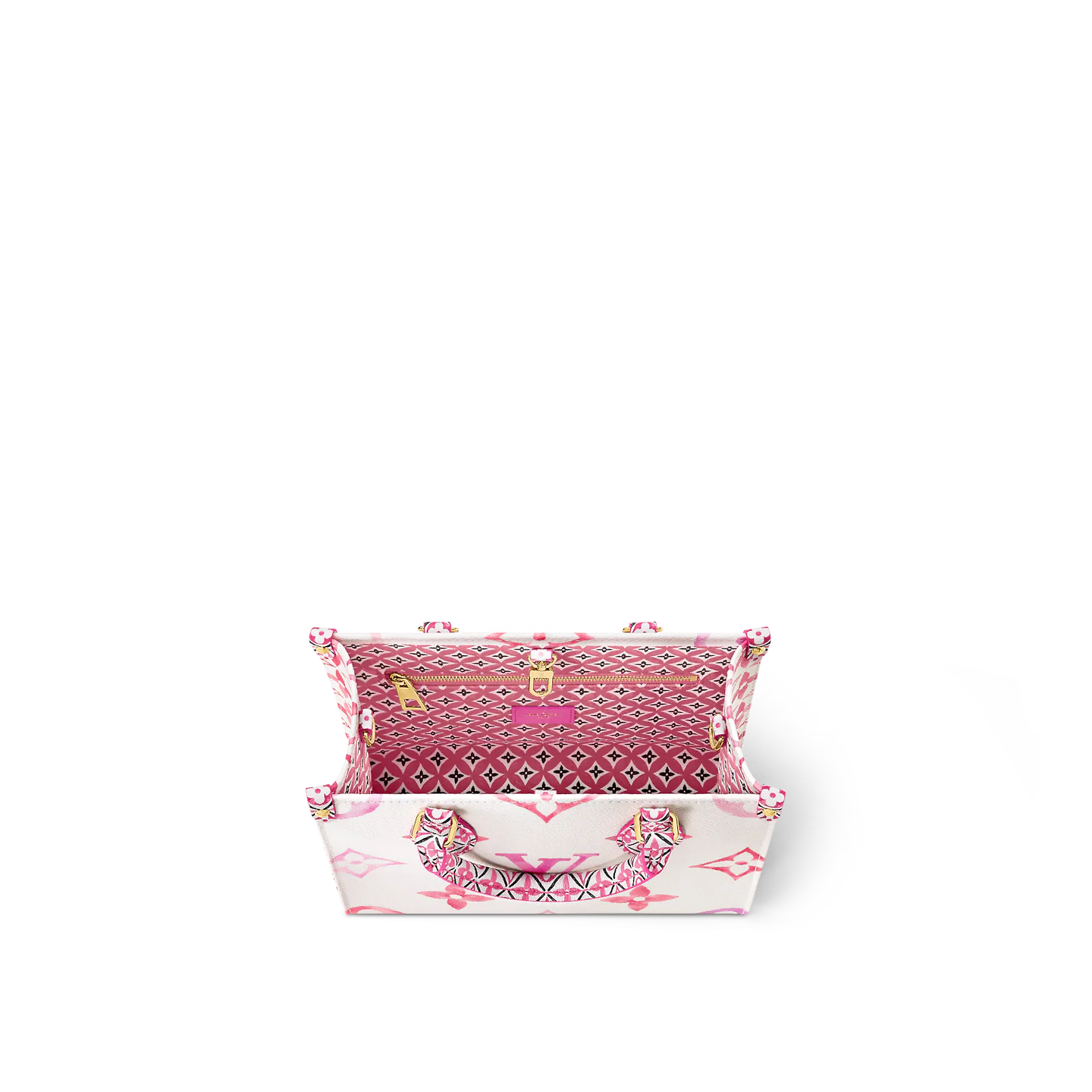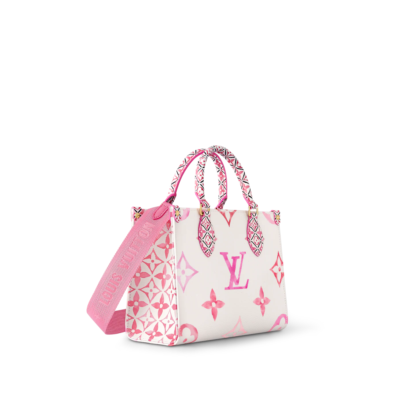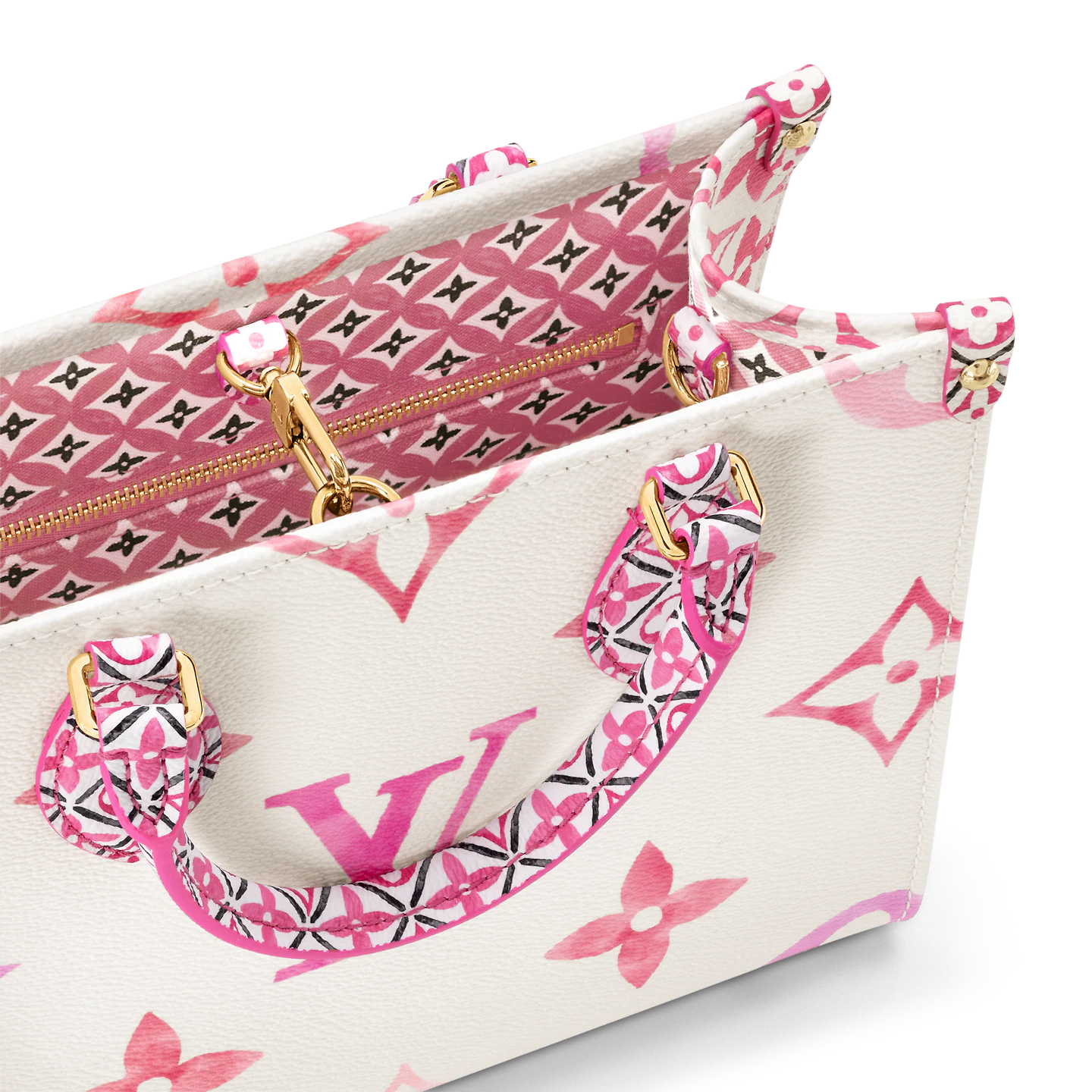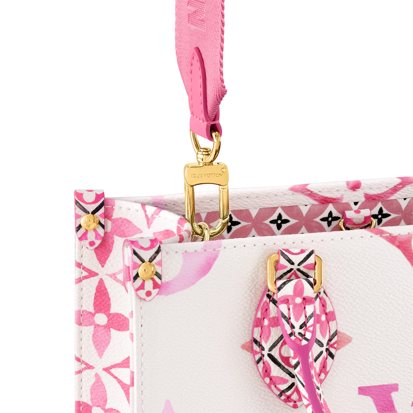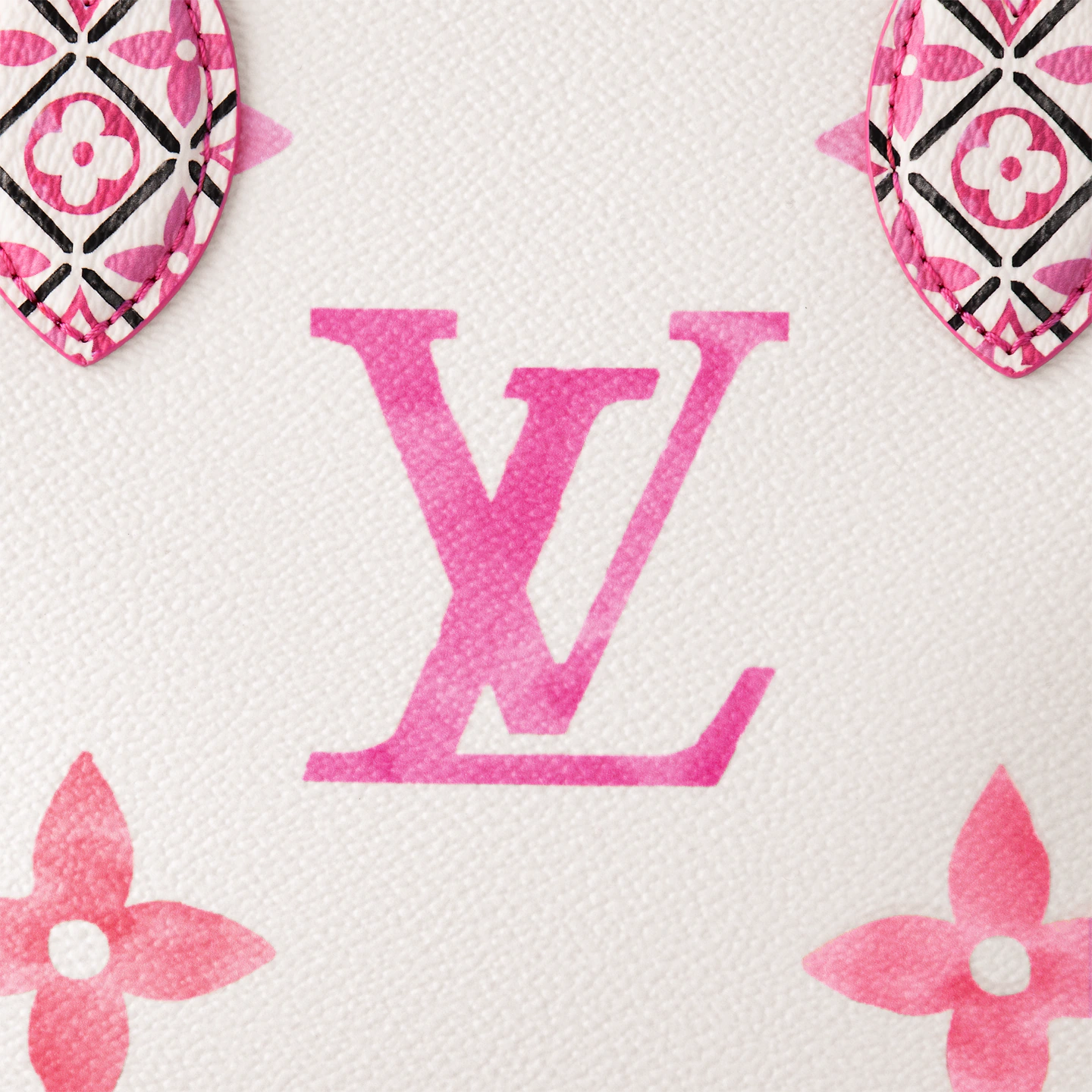 The OnTheGo PM is a handbag-sized tote in cream-color canvas with a pastel-color Giant Monogram pattern. The pattern is paired with trim and top handles in a dense motif of Monogram Flowers inspired by the traditional azulejo ceramics of Portugal. A removable and adjustable strap enables shoulder wear.