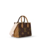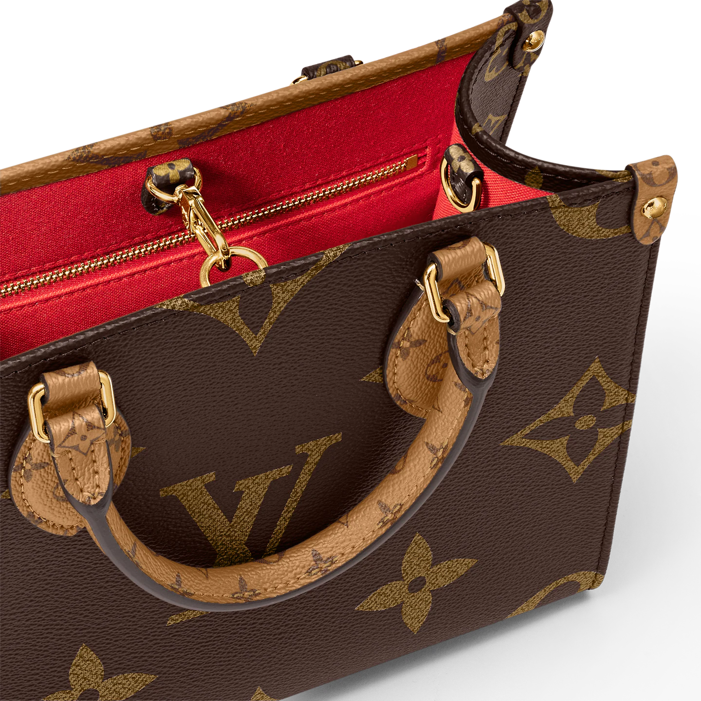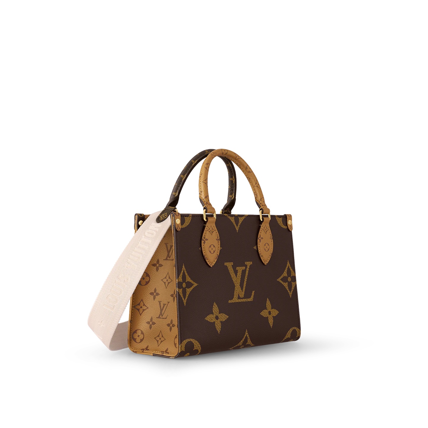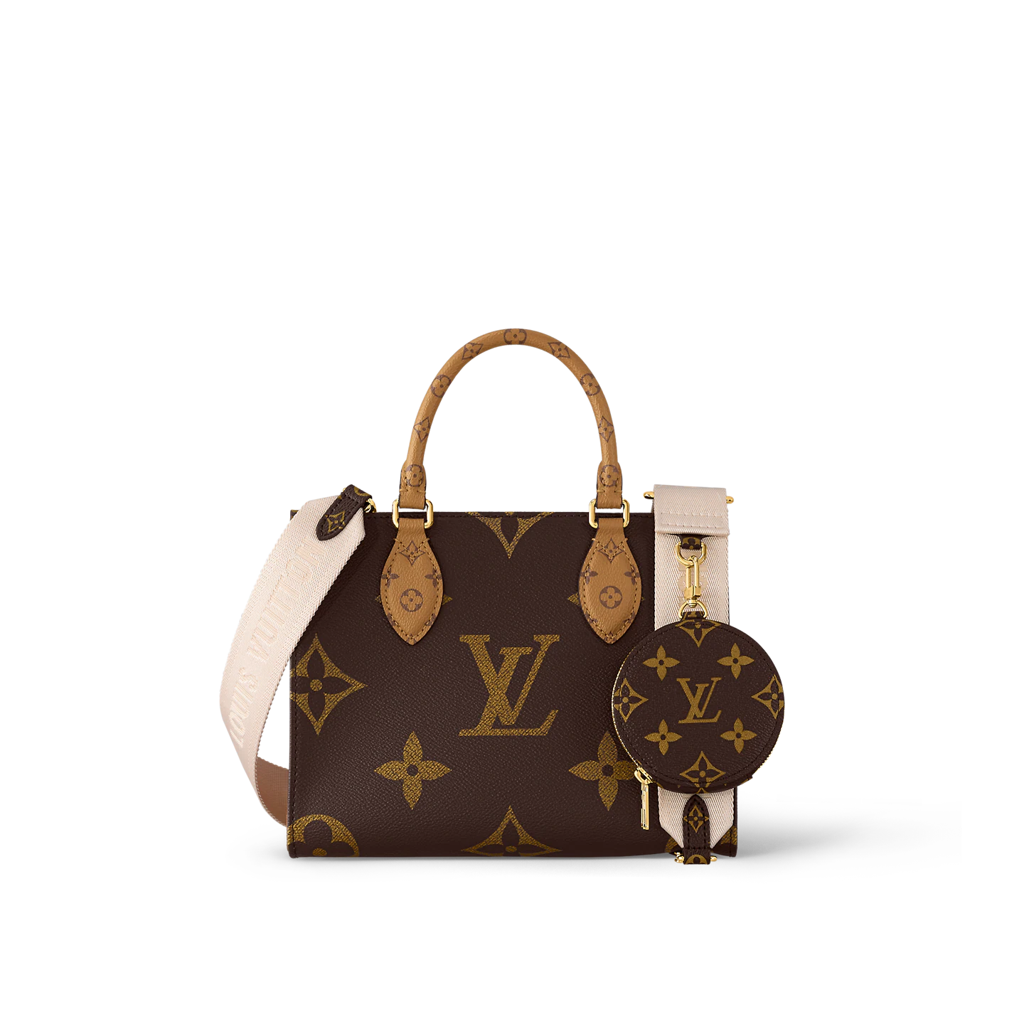 Both fashionable and functional. this OnTheGo PM tote is an ideal everyday companion. Made from a mix of Monogram and Monogram Reverse canvas with the on-trend Giant pattern. it is fitted with Toron handles and a signature woven jacquard strap in contrasting cr??me beige. The detachable coin purse is perfect for storing change or tiny treasures.