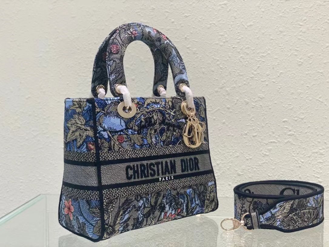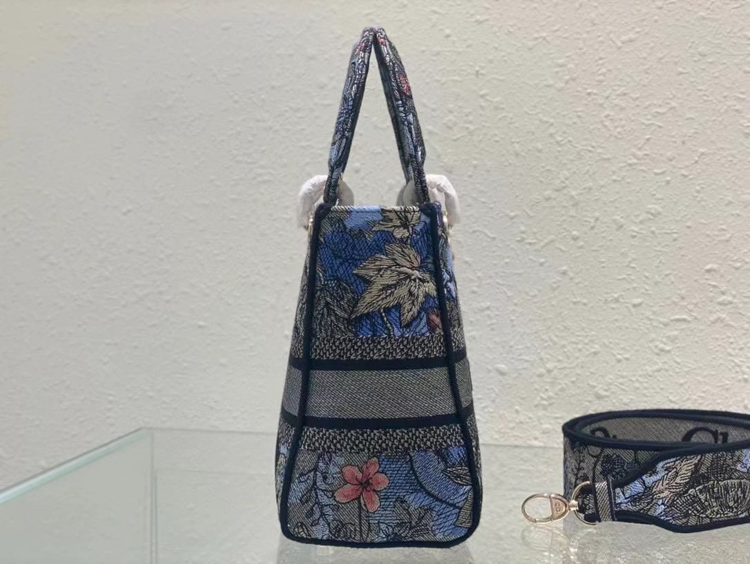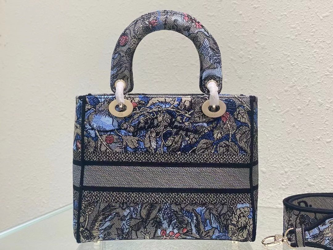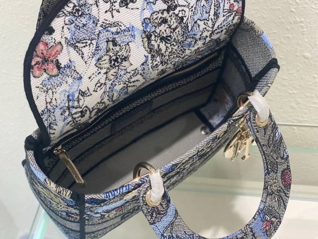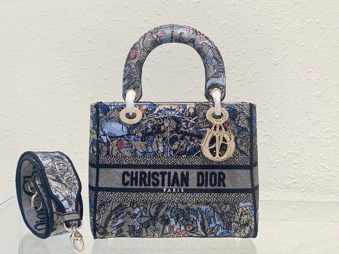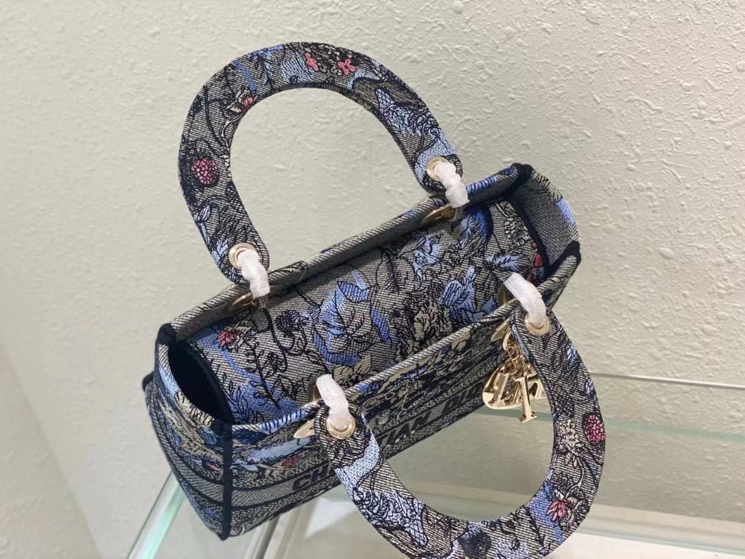 The five-compartment embroidered Magic Garden handbag combines classic elegance with a stylish look. Crafted in denim fabric. the entire body is decorated with multi-coloured diorjardinmagique pattern embroidery. drawing inspiration from the wizarding world to display charming pastoral patterns. The front is decorated with the christian dior paris logo. and the light gold finish metal di.or pendant raises the tone and adds a touch of inspiration to the exquisite silhouette. Medium style with detachable double-sided embroidered wide shoulder strap. portable or crossbody. Dimensions :24x20x11 cm