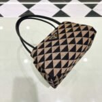 A study of the lines characterizes this small leather handbag. It stands out for its absolutely elegant silhouette emphasized by the long. narrow leather handle. The triangle becomes a luxurious modern and multifaceted embroidered motif. an affirmation of Prada’s unmistakable image.