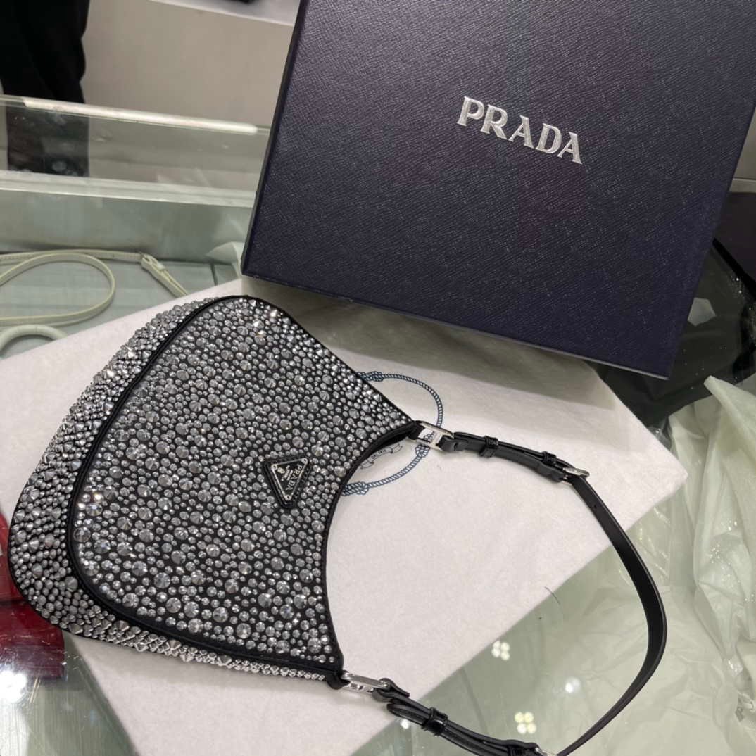 Feminine. elegant and modern. the Prada Cleo bag is made of satin and embellished with luminous crystals of different sizes that give the bag refined charm. The sinuous shape that recalls archive styles makes the accessory iconic.