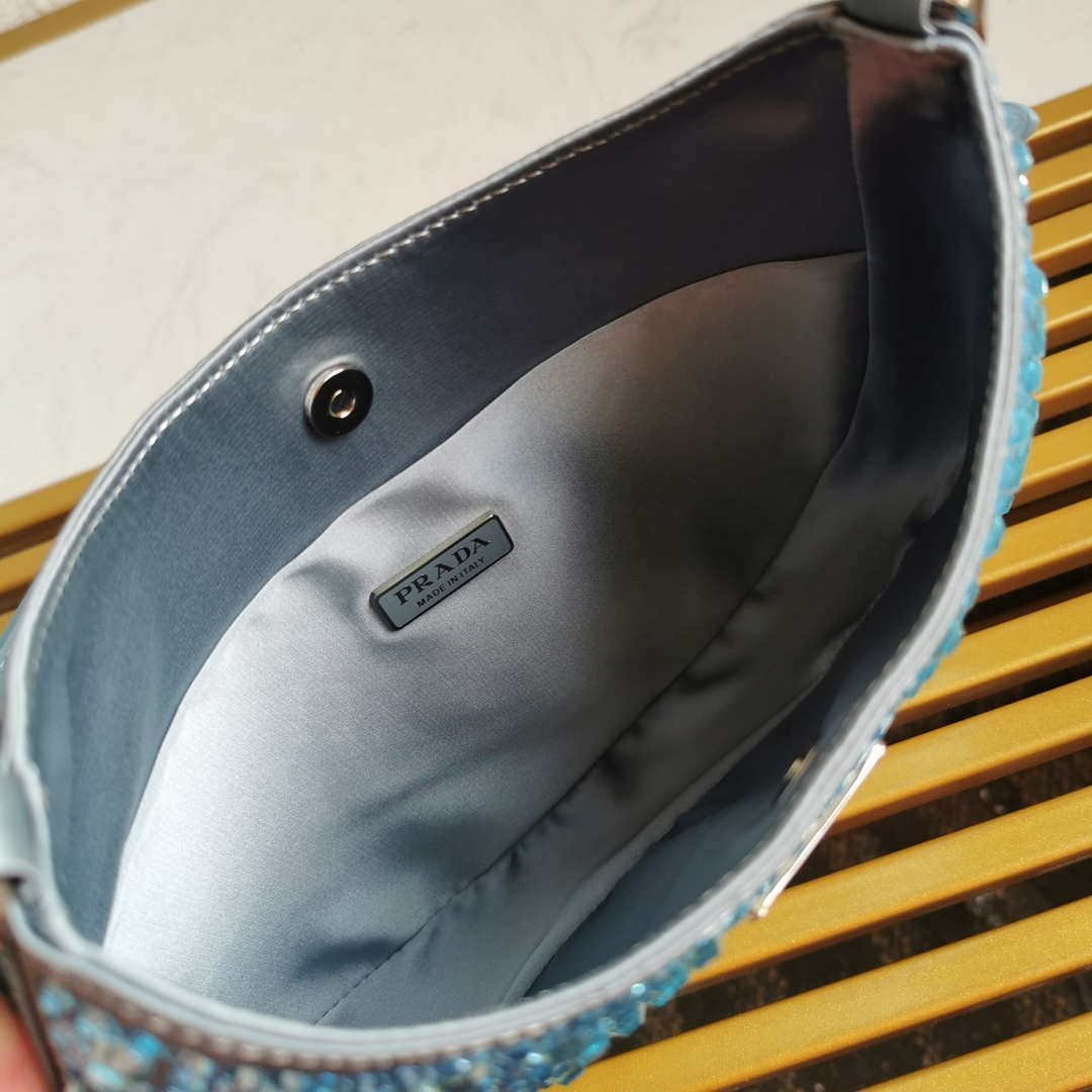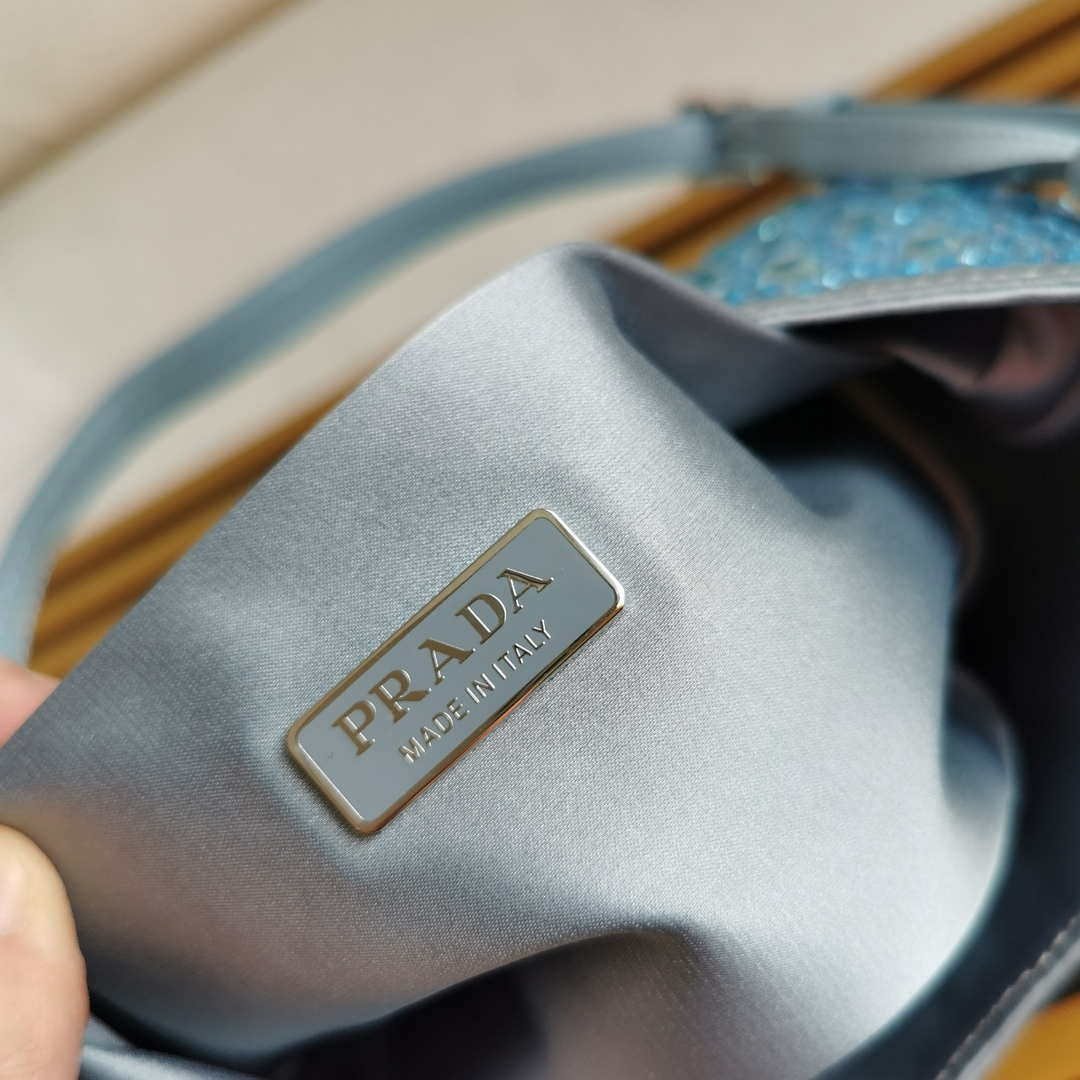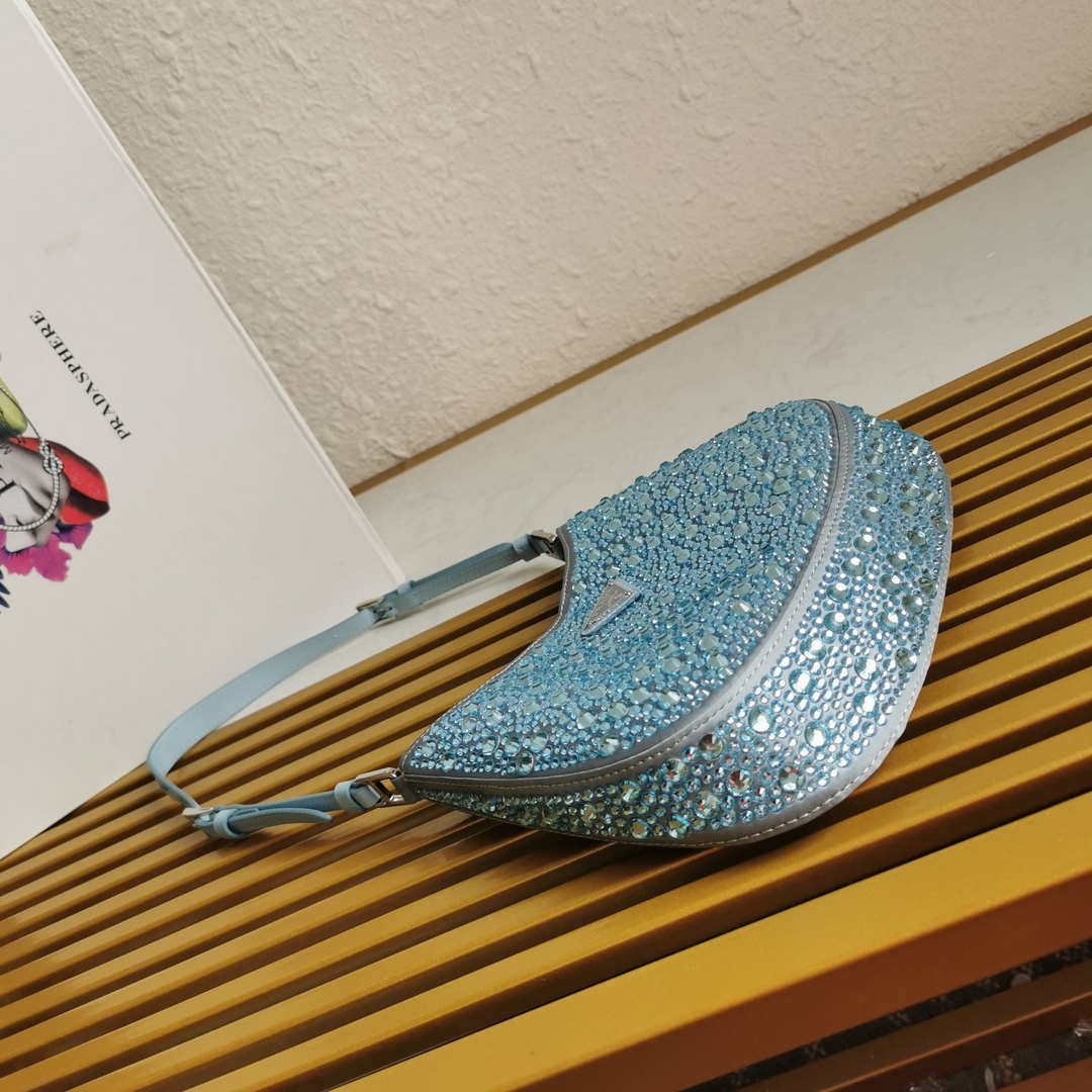 Feminine. elegant and modern. the Prada Cleo bag is made of satin and embellished with luminous crystals of different sizes that give the bag refined charm. The sinuous shape that recalls archive styles makes the accessory iconic.