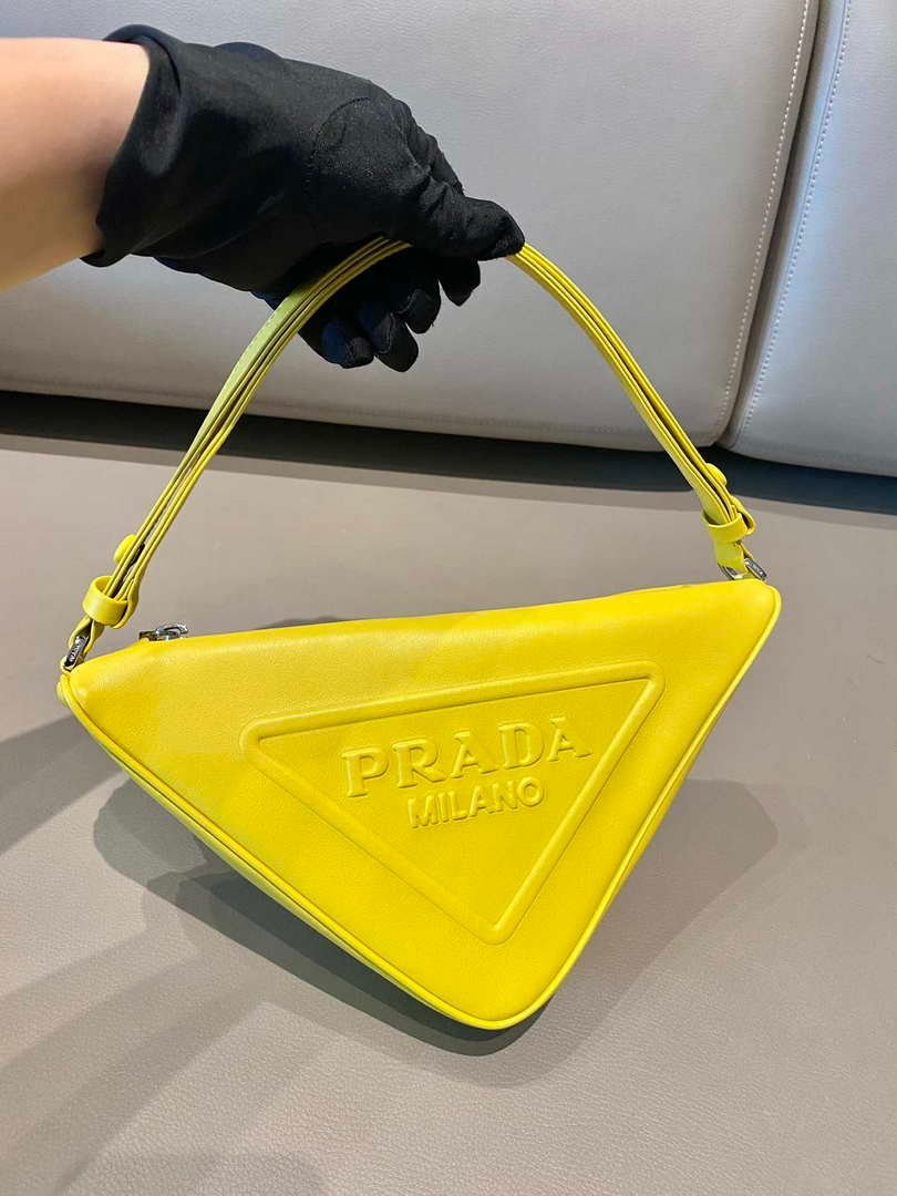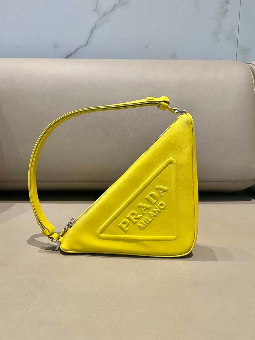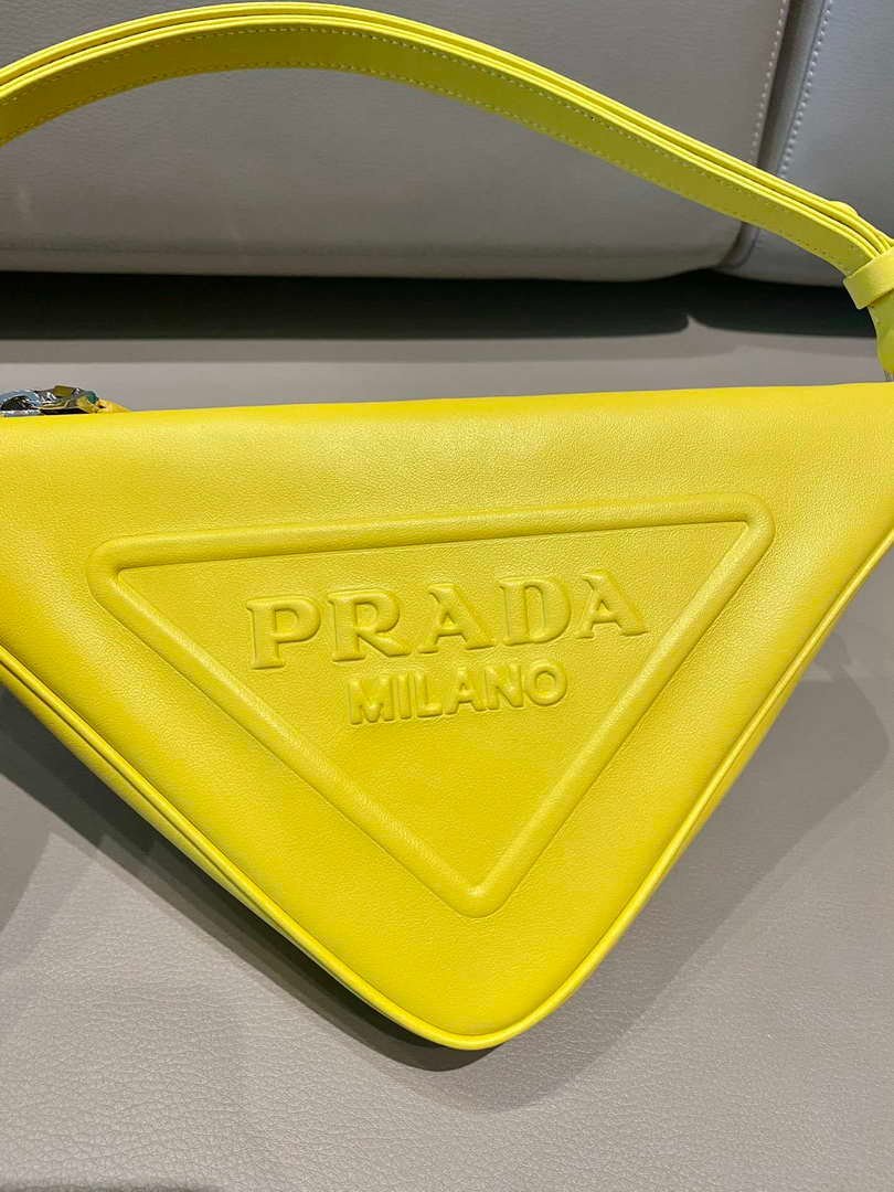 Prada 1NQ043 Triangle leather pouch Yellow on sale now.