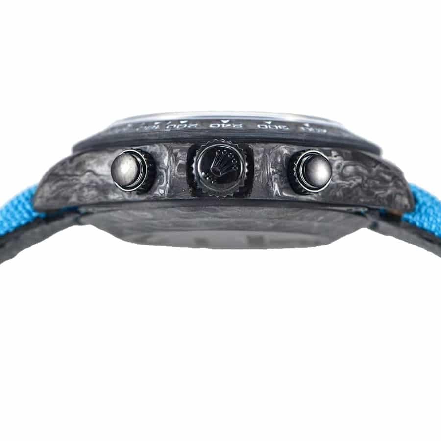 Crafted with a 904L stainless steel case featuring a forged carbon color. this 40.00 mm timepiece boasts robustness and a commanding presence on the wrist. The sapphire crystal ensures that the dial remains scratch-free and clear. giving the watch an everlasting pristine look. The fabric bracelet. adjustable to fit any wrist comfortably. is secured with a 904L stainless steel pin buckle clasp. harmoniously blending blue and black hues. adding an athletic yet sophisticated elegance.