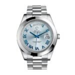 This Rolex Day-Date II Stainless Steel Ice Blue Roman Dial 218206 Replica is a stunning watch. It features a 904L stainless steel case and bezel. with a sapphire crystal and adjustable links for all sizes. The dial is ice blue with Roman numerals and stick hands. The movement is an automatic 3156 caliber with a 60-hour power reserve and precision within COSC certification limits. The watch is water-resistant up to 30m and comes with a full 2-year international warranty.