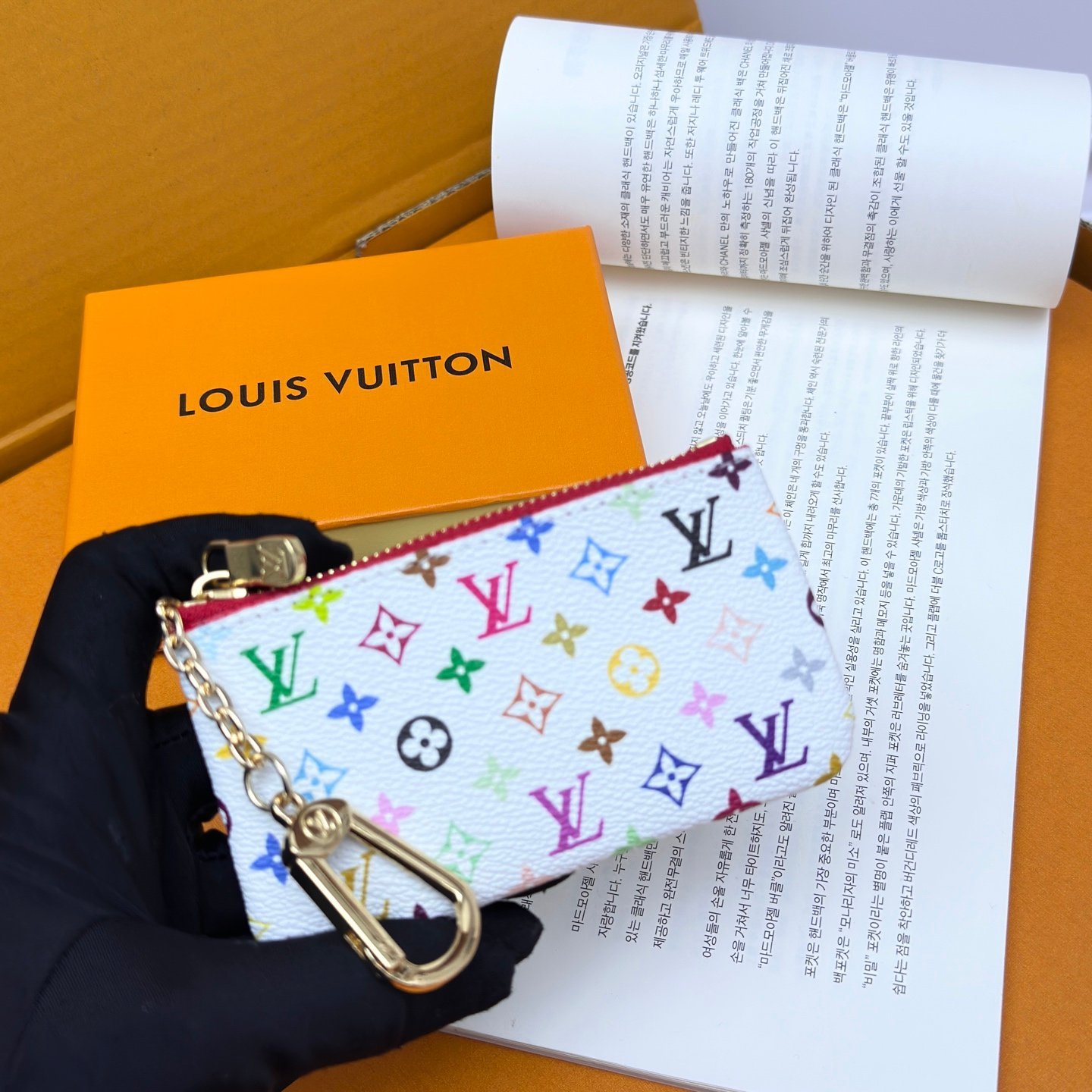 M62650 33-color key case wallet series. This key case features Monogram Ld printing in 33 vivid colors, interpreting the 2025 Murakami Takashi and Louis Vuitton collaboration’s white and black 33-color series. Launched in twelve sections, it is extremely popular worldwide and loved by celebrities. It is lively, childlike and friendly. With a leather lining, it creates an elegant structure and can also hold cash and cards. Size: 12.0 x 7.0 x 1.5 cm.