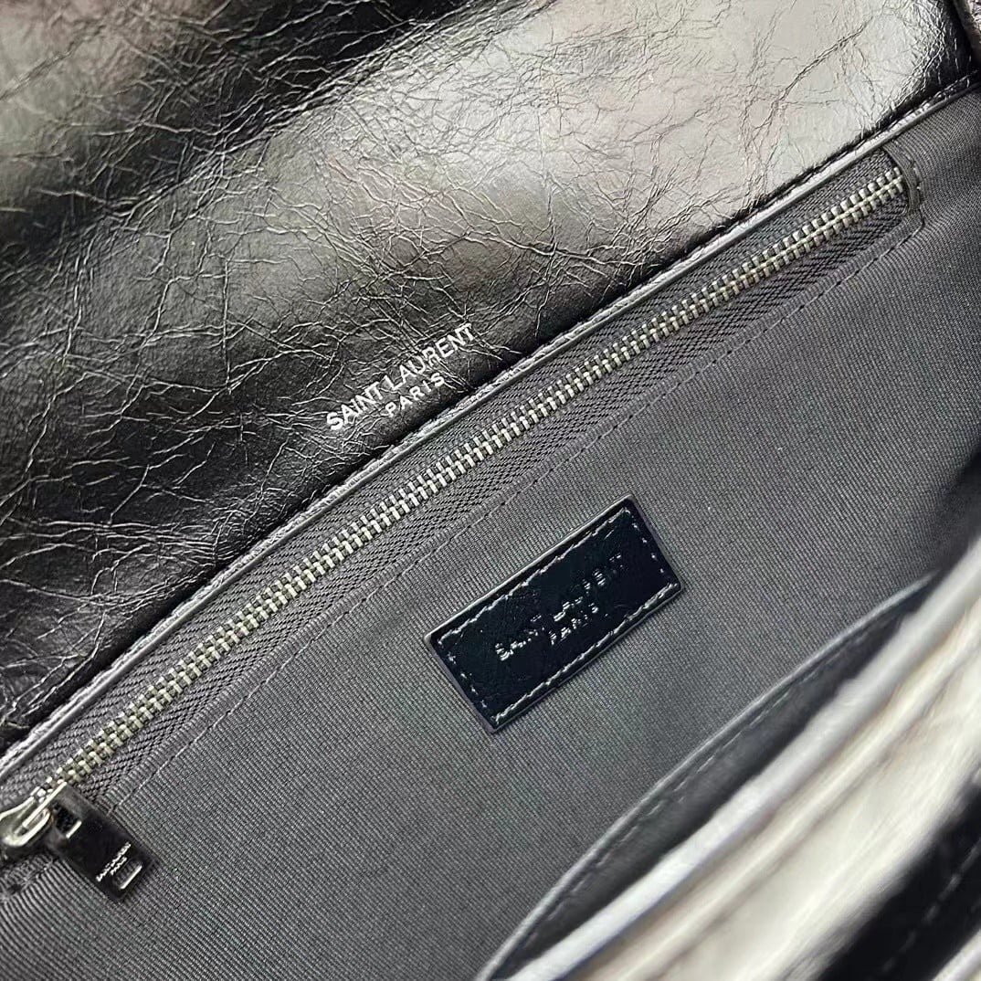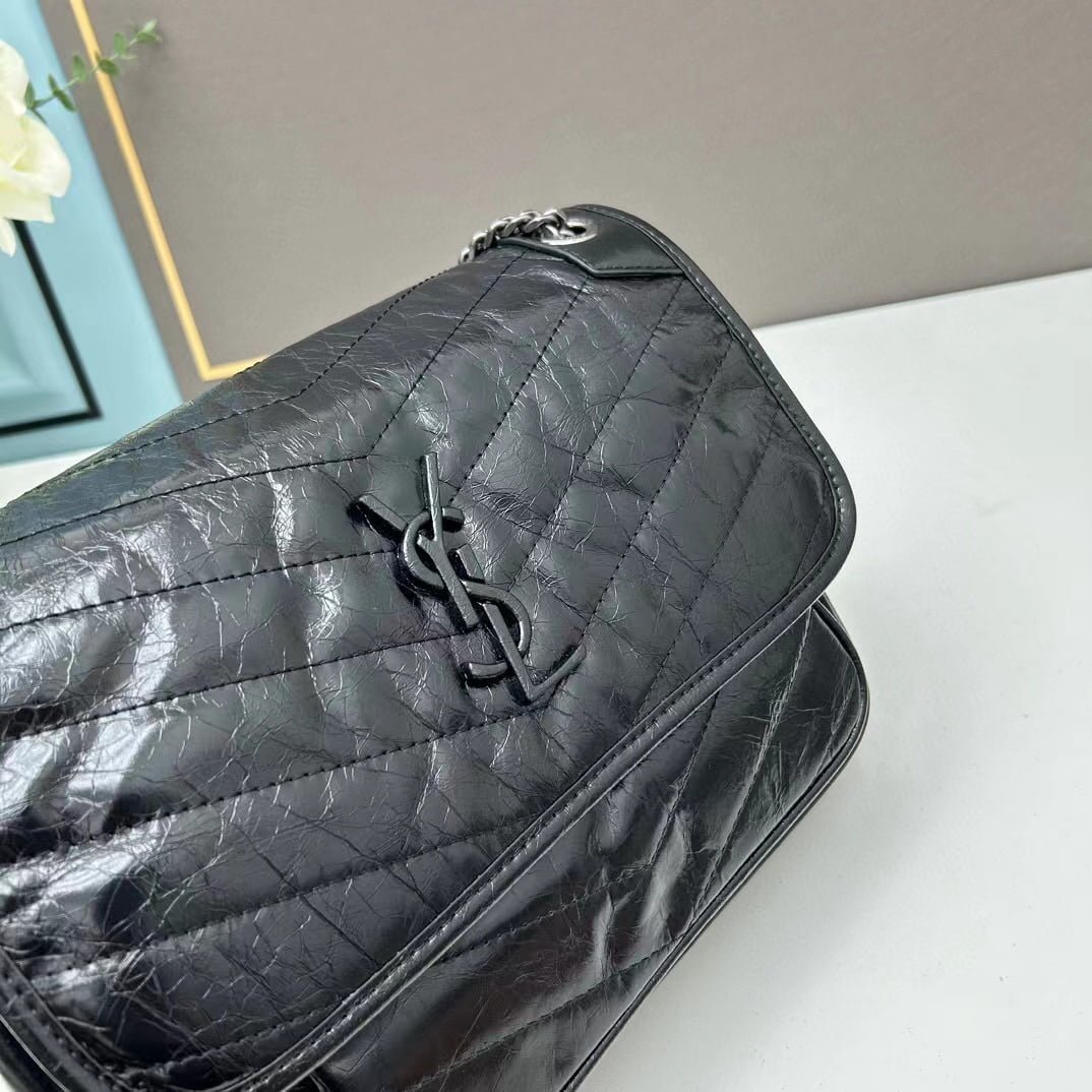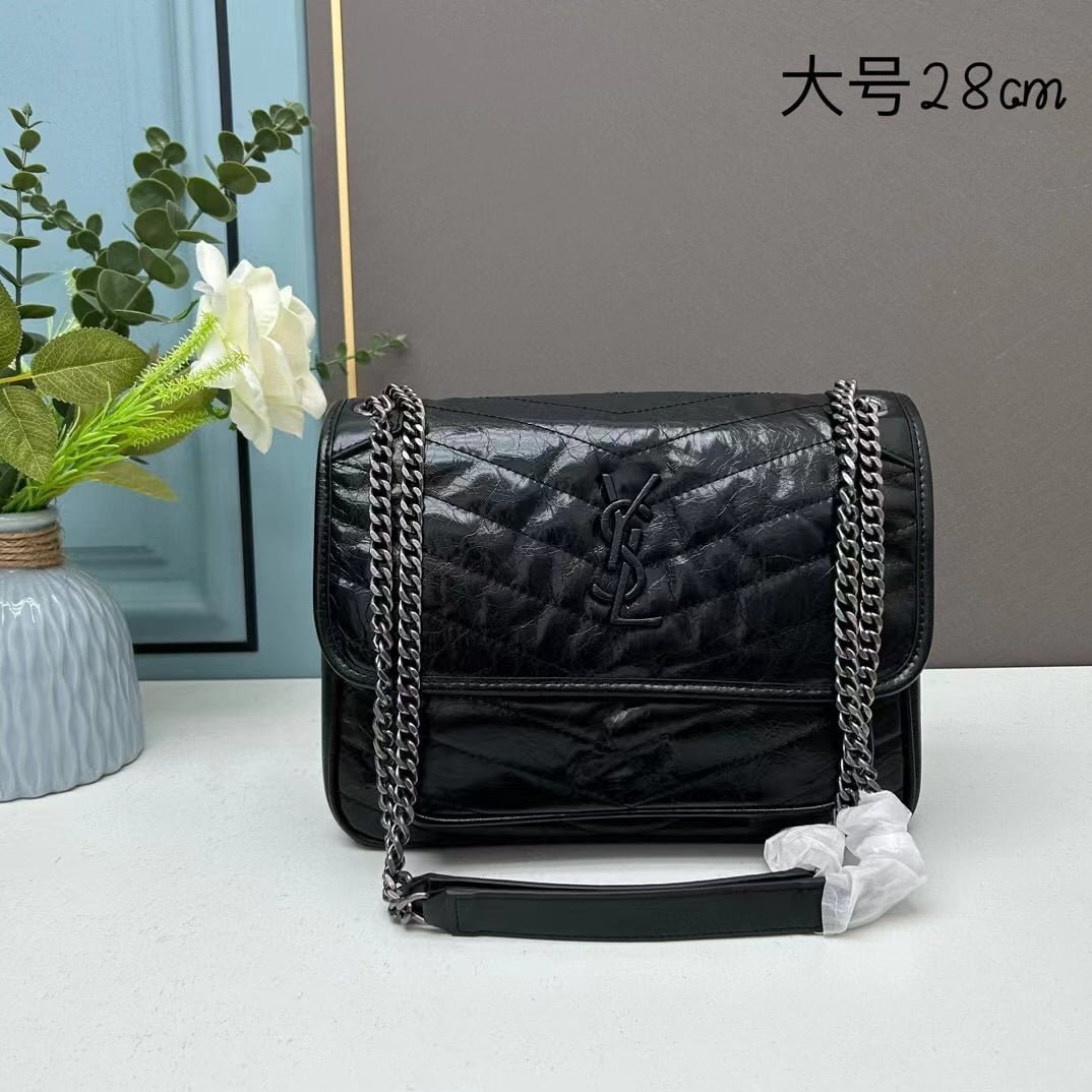 LAURENT front clamshell bag with real leather-covered YSL trim. chain and leather multi-purpose shoulder strap. center compartment and open back pocket. Size 28CM imported leather dual-purpose chain shoulder strap 1 center compartment. 1 inner bag. 1 zipper pocket. 1 open progen. 1 flip bottom pocket